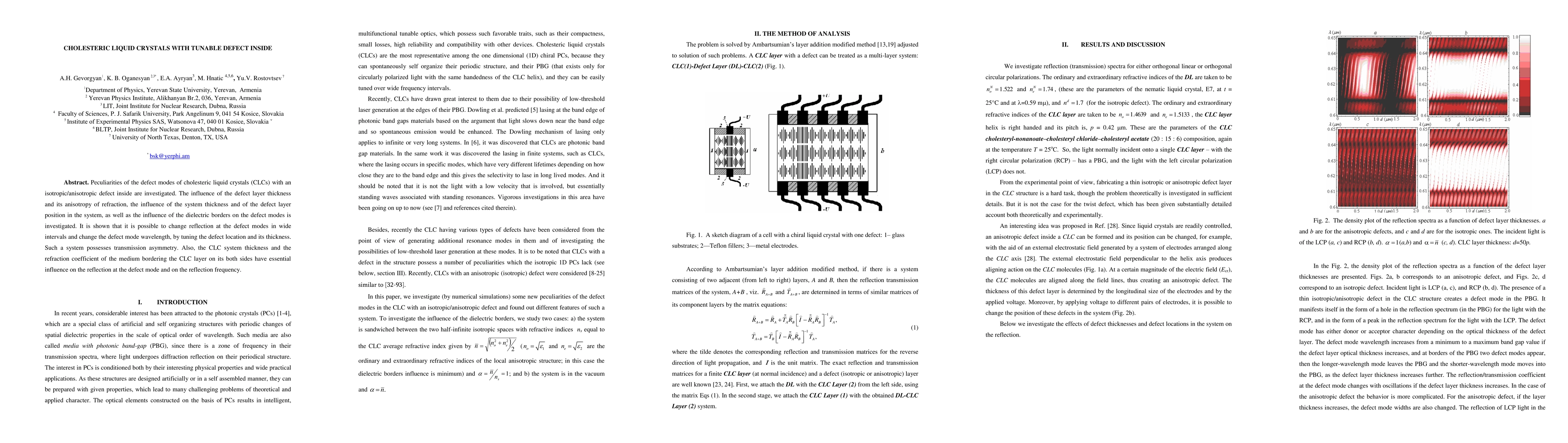 This paper investigates cholesteric liquid crystals (CLCs) with tunable defects, exploring how defect layer thickness, anisotropy, system thickness, and dielectric borders influence defect modes. The study reveals that adjusting defect location and thickness can widely change reflection and defect mode wavelength, with significant effects from system thickness and bordering refraction coefficients.