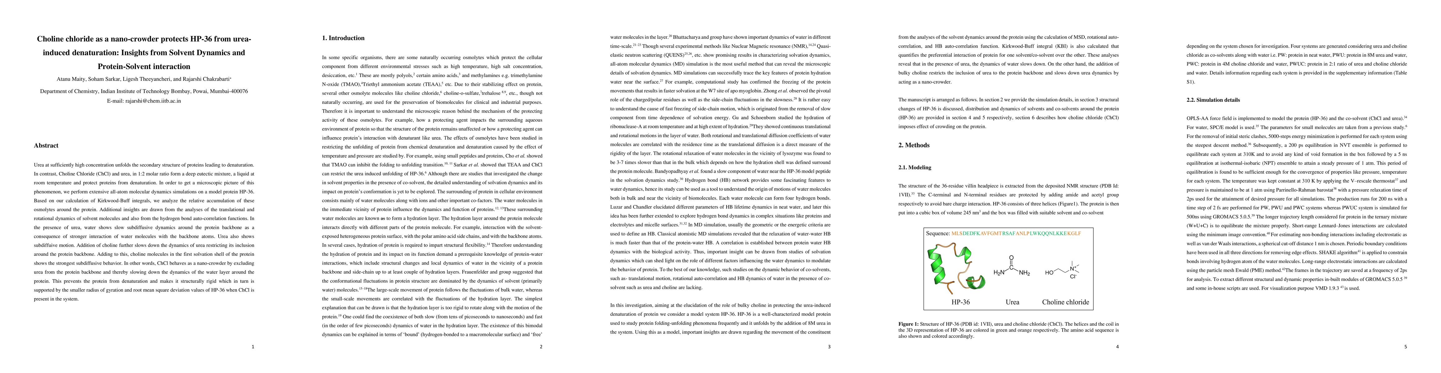 This study investigates how choline chloride (ChCl) protects the protein HP-36 from urea-induced denaturation using molecular dynamics simulations. ChCl, when combined with urea, acts as a nano-crowder, slowing down solvent dynamics and preventing protein denaturation by restricting urea's interaction with the protein backbone.