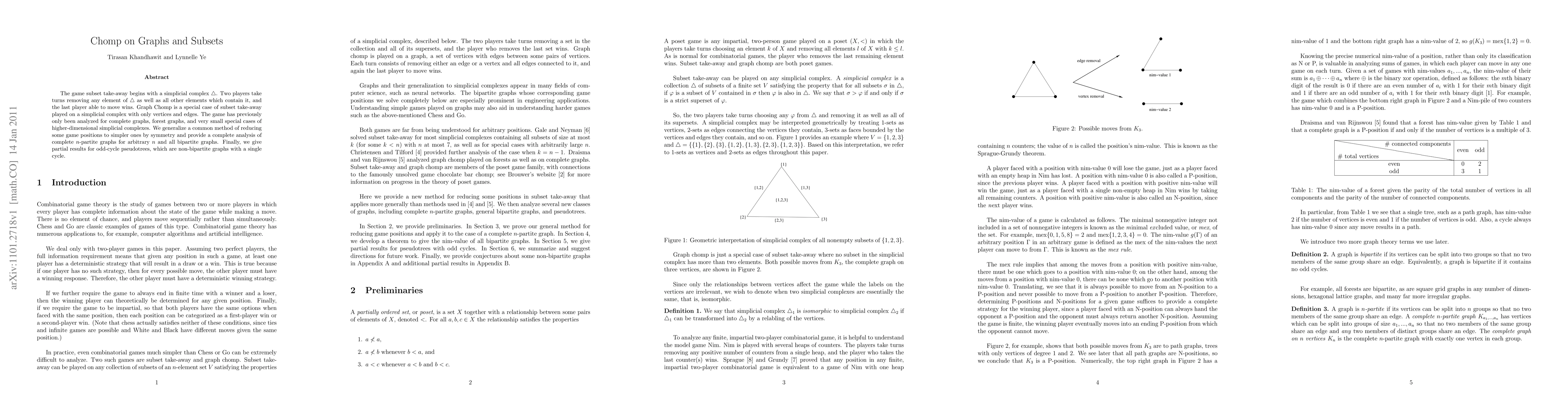 The game subset take-away begins with a simplicial complex \Delta. Two players take turns removing any element of \Delta as well as all other elements which contain it, and the last player able to move wins. Graph Chomp is a special case of subset take-away played on a simplicial complex with only vertices and edges. The game has previously only been analyzed for complete graphs, forest graphs, and very small special cases of higher-dimensional simplicial complexes. We generalize a common method of reducing some game positions to simpler ones by symmetry and provide a complete analysis of complete n-partite graphs for arbitrary n and all bipartite graphs. Finally, we give partial results for odd-cycle pseudotrees, which are non-bipartite graphs with a single cycle.