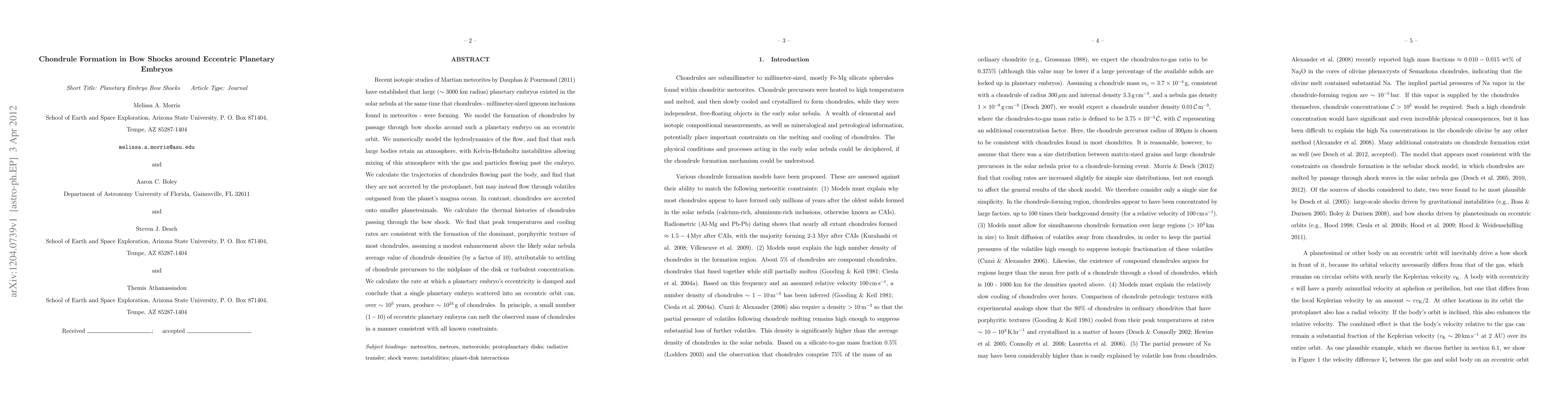 This paper models chondrule formation via bow shocks around large, eccentric planetary embryos in the solar nebula, finding that these embryos can generate the observed mass of chondrules through Kelvin-Helmholtz instabilities and thermal processes, consistent with their dominant porphyritic texture.