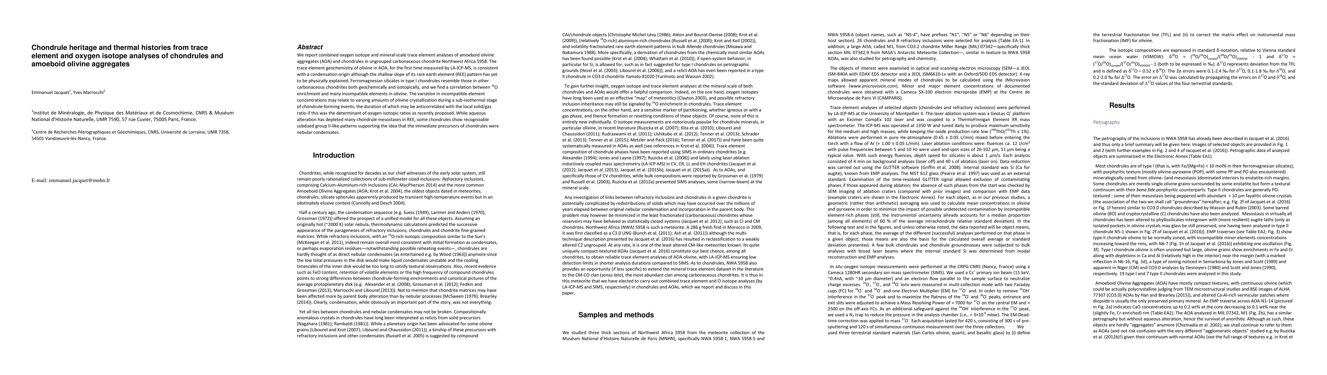 First to report combined trace element and oxygen isotope analyses of AOA and type I chondrules in a primitive chondrite, revealing new insights into their formation and thermal histories.