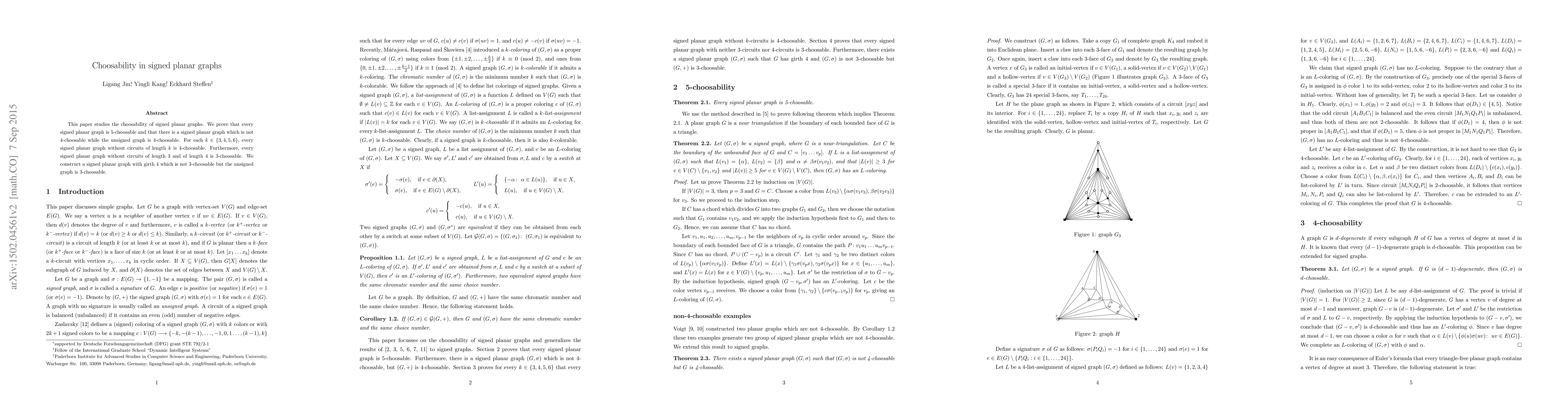 Summary: The paper establishes that every signed planar graph is 5-choosable, while certain constraints on the graph's structure affect its choosability, showing that signed planar graphs without circuits of length 3 to 6 are 4-choosable and those without circuits of length 3 and 4 are 3-choosable. It also presents a signed planar graph with girth 4 that fails to be 3-choosable despite its unsigned counterpart being 3-choosable.