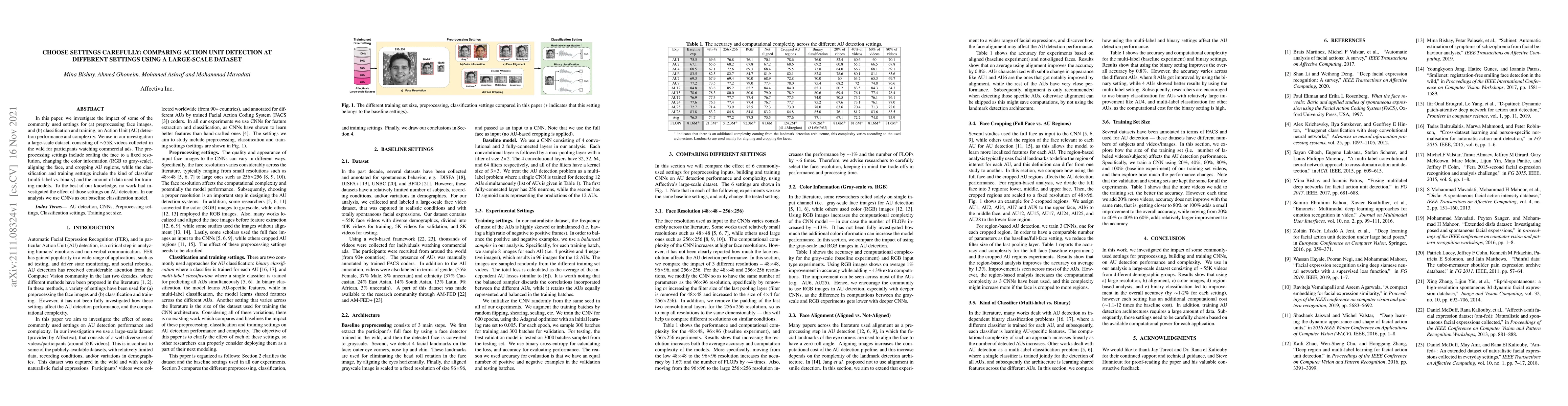 In this paper, we investigate the impact of some of the commonly used settings for (a) preprocessing face images, and (b) classification and training, on Action Unit (AU) detection performance and complexity. We use in our investigation a large-scale dataset, consisting of ~55K videos collected in the wild for participants watching commercial ads. The preprocessing settings include scaling the face to a fixed resolution, changing the color information (RGB to gray-scale), aligning the face, and cropping AU regions, while the classification and training settings include the kind of classifier (multi-label vs. binary) and the amount of data used for training models. To the best of our knowledge, no work had investigated the effect of those settings on AU detection. In our analysis we use CNNs as our baseline classification model.