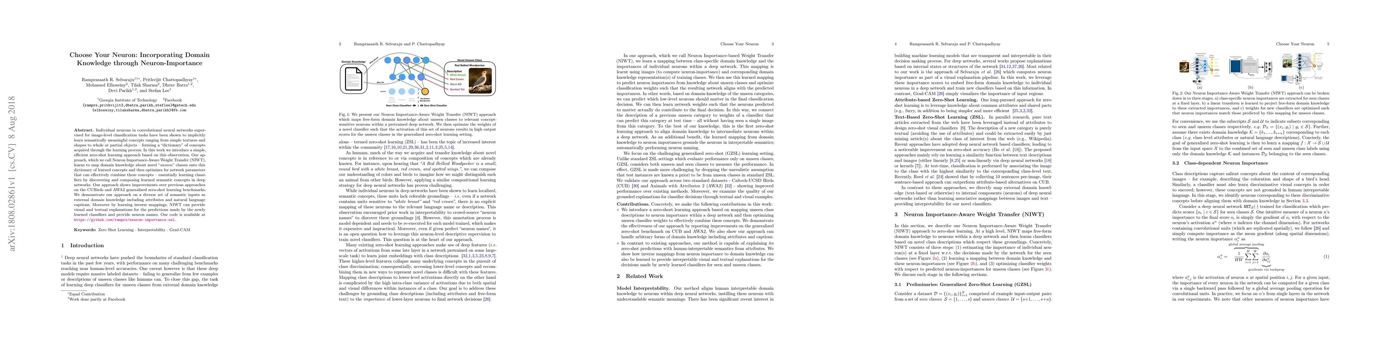 This paper introduces Neuron Importance-Aware Weight Transfer (NIWT), a method for zero-shot learning that leverages the semantic concepts learned by individual neurons in convolutional neural networks to classify unseen classes. NIWT maps domain knowledge onto the learned concept dictionary and optimizes network parameters to combine these concepts, demonstrating improved performance on zero-shot learning benchmarks.
