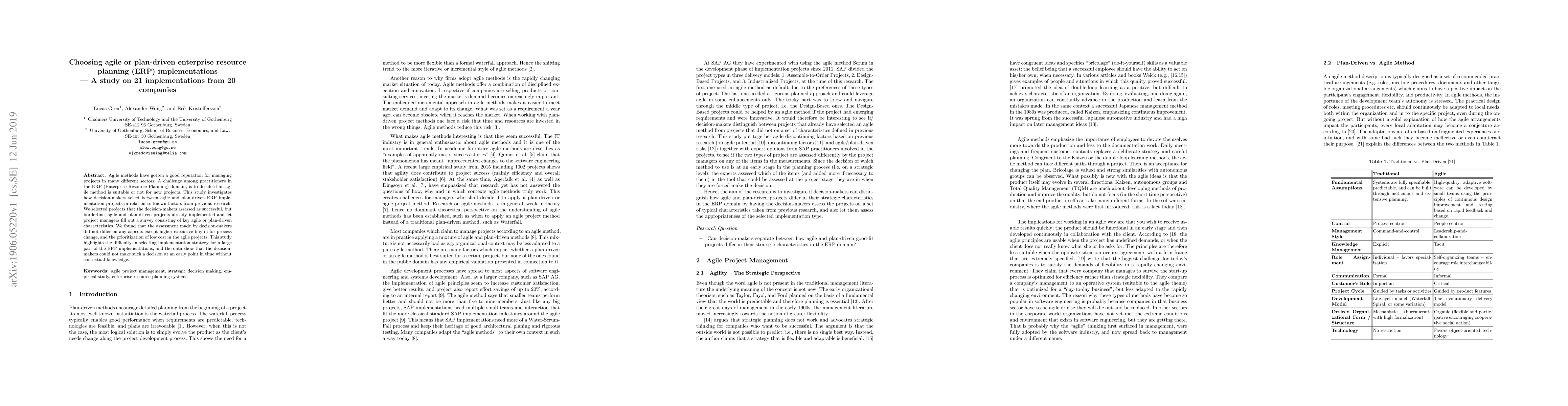 This study examines the selection process between agile and plan-driven ERP implementations, finding that decision-makers' assessments differ only in executive buy-in and cost prioritization, highlighting the challenge of choosing an implementation strategy without contextual knowledge.