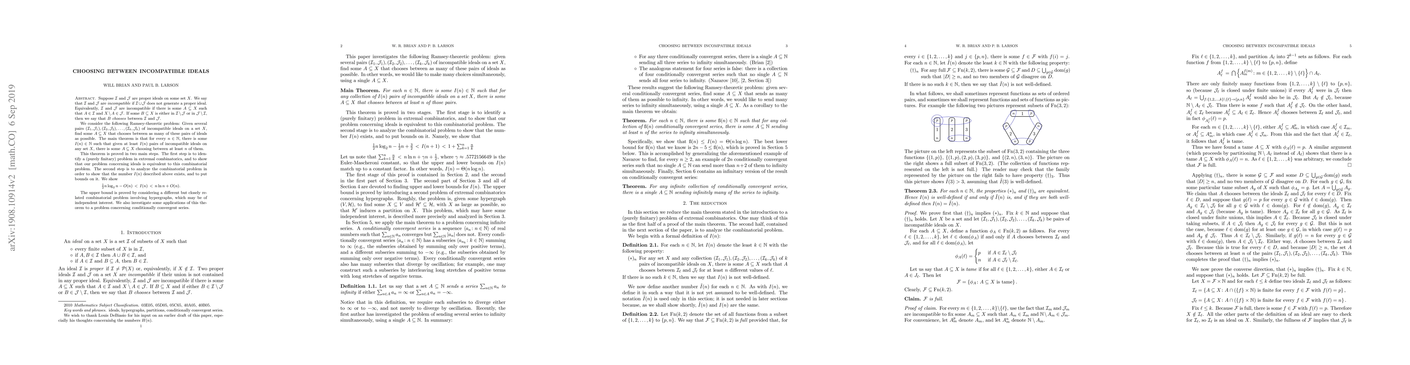 This paper tackles a Ramsey-theoretic problem concerning incompatible ideals on a set X. It establishes that for any natural number n, there exists a threshold I(n) such that given at least I(n) pairs of incompatible ideals, a subset A of X can be found that chooses between at least n of these pairs. The proof involves linking the ideal problem to a finitary extremal combinatorics issue and providing bounds: rac{1}{2}n log_2 n - O(n) < I(n) < n ln n + O(n). The findings also touch on applications to conditionally convergent series.