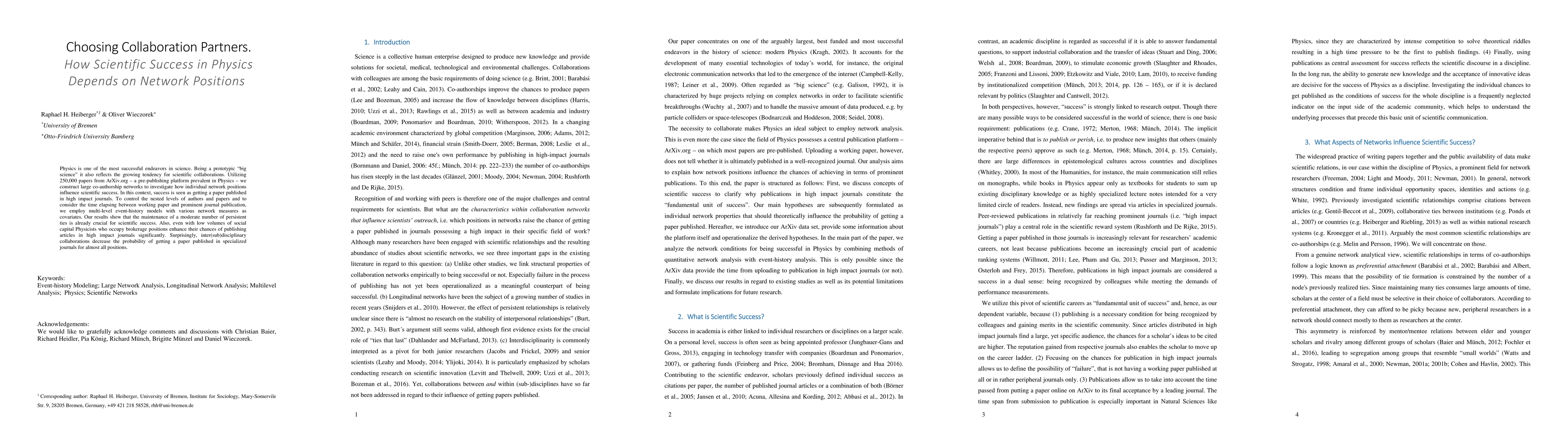 Physics is one of the most successful endeavors in science. Being a prototypic big science it also reflects the growing tendency for scientific collaborations. Utilizing 250,000 papers from ArXiv.org a prepublishing platform prevalent in Physics we construct large coauthorship networks to investigate how individual network positions influence scientific success. In this context, success is seen as getting a paper published in high impact journals of physical subdisciplines as compared to not getting it published at all or in rather peripheral journals only. To control the nested levels of authors and papers, and to consider the time elapsing between working paper and prominent journal publication we employ multilevel eventhistory models with various network measures as covariates. Our results show that the maintenance of even a moderate number of persistent ties is crucial for scientific success. Also, even with low volumes of social capital Physicists who occupy brokerage positions enhance their chances of articles in high impact journals significantly. Surprisingly, inter(sub)disciplinary collaborations decrease the probability of getting a paper published in specialized journals for almost all positions.