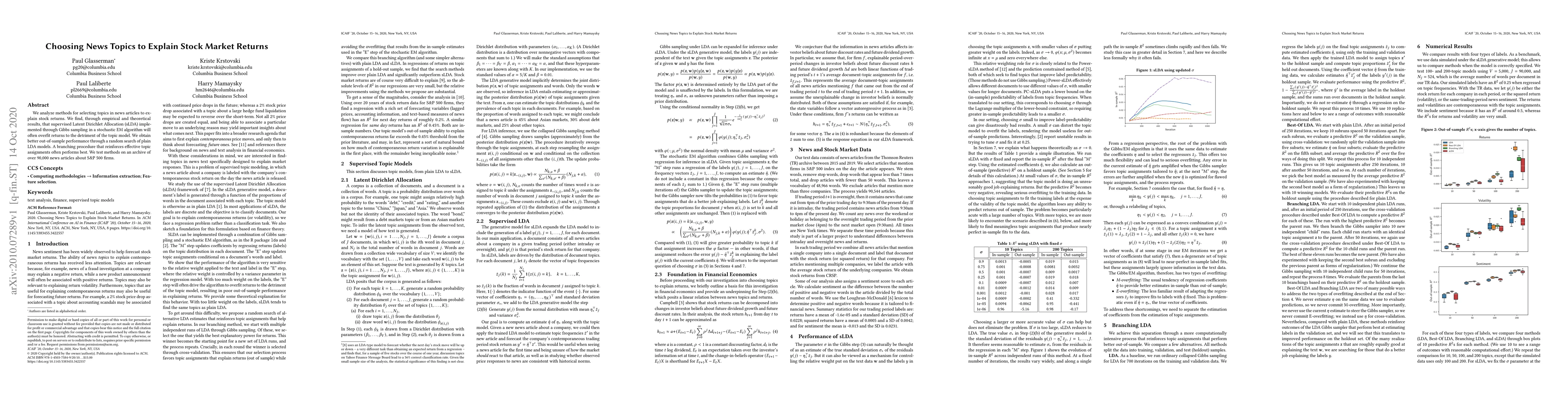 We analyze methods for selecting topics in news articles to explain stock returns. We find, through empirical and theoretical results, that supervised Latent Dirichlet Allocation (sLDA) implemented through Gibbs sampling in a stochastic EM algorithm will often overfit returns to the detriment of the topic model. We obtain better out-of-sample performance through a random search of plain LDA models. A branching procedure that reinforces effective topic assignments often performs best. We test methods on an archive of over 90,000 news articles about S&P 500 firms.