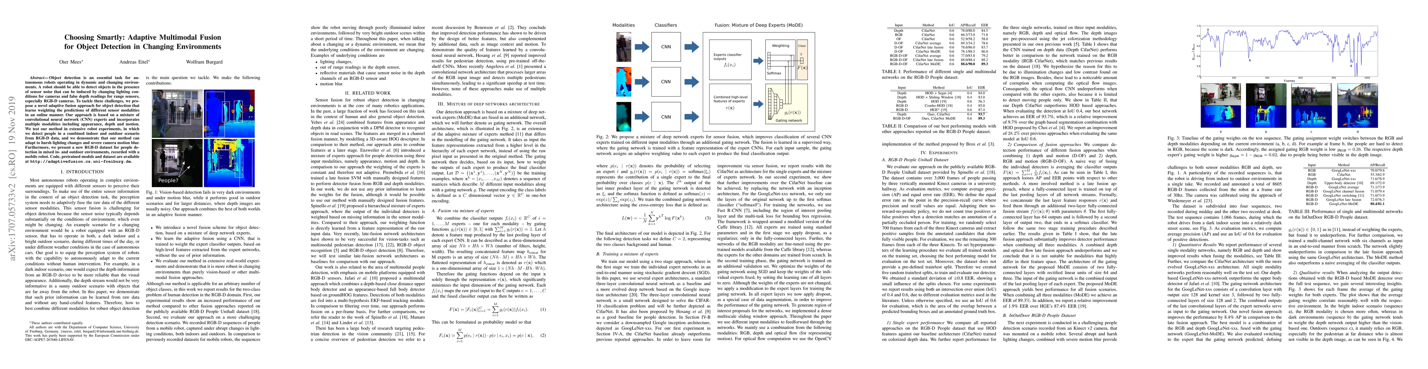 Object detection is an essential task for autonomous robots operating in dynamic and changing environments. A robot should be able to detect objects in the presence of sensor noise that can be induced by changing lighting conditions for cameras and false depth readings for range sensors, especially RGB-D cameras. To tackle these challenges, we propose a novel adaptive fusion approach for object detection that learns weighting the predictions of different sensor modalities in an online manner. Our approach is based on a mixture of convolutional neural network (CNN) experts and incorporates multiple modalities including appearance, depth and motion. We test our method in extensive robot experiments, in which we detect people in a combined indoor and outdoor scenario from RGB-D data, and we demonstrate that our method can adapt to harsh lighting changes and severe camera motion blur. Furthermore, we present a new RGB-D dataset for people detection in mixed in- and outdoor environments, recorded with a mobile robot. Code, pretrained models and dataset are available at http://adaptivefusion.cs.uni-freiburg.de