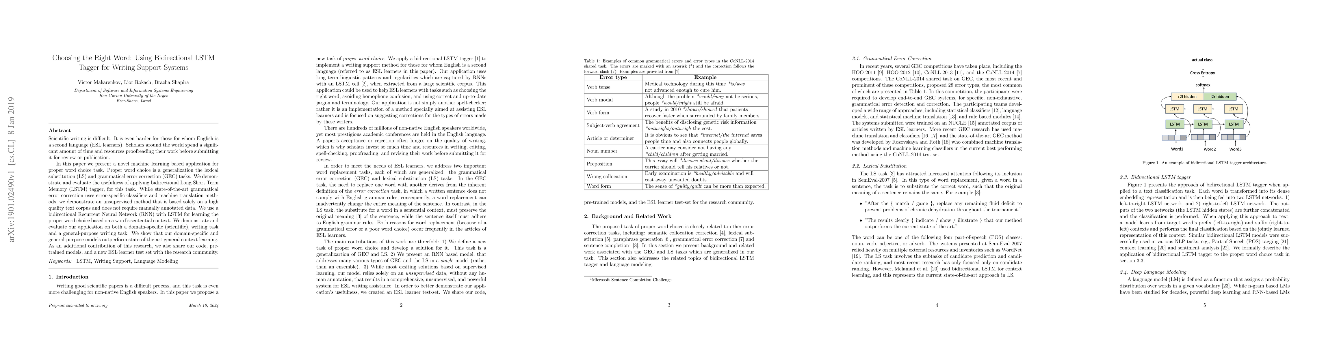 Scientific writing is difficult. It is even harder for those for whom English is a second language (ESL learners). Scholars around the world spend a significant amount of time and resources proofreading their work before submitting it for review or publication. In this paper we present a novel machine learning based application for proper word choice task. Proper word choice is a generalization the lexical substitution (LS) and grammatical error correction (GEC) tasks. We demonstrate and evaluate the usefulness of applying bidirectional Long Short Term Memory (LSTM) tagger, for this task. While state-of-the-art grammatical error correction uses error-specific classifiers and machine translation methods, we demonstrate an unsupervised method that is based solely on a high quality text corpus and does not require manually annotated data. We use a bidirectional Recurrent Neural Network (RNN) with LSTM for learning the proper word choice based on a word's sentential context. We demonstrate and evaluate our application on both a domain-specific (scientific), writing task and a general-purpose writing task. We show that our domain-specific and general-purpose models outperform state-of-the-art general context learning. As an additional contribution of this research, we also share our code, pre-trained models, and a new ESL learner test set with the research community.