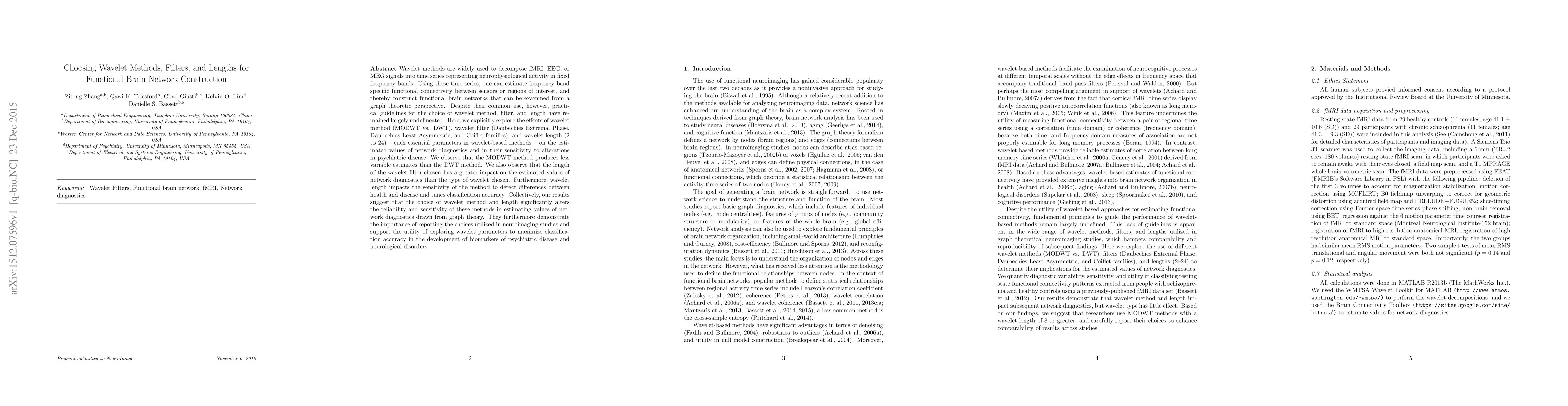 Wavelet methods are widely used to decompose fMRI, EEG, or MEG signals into time series representing neurophysiological activity in fixed frequency bands. Using these time series, one can estimate frequency-band specific functional connectivity between sensors or regions of interest, and thereby construct functional brain networks that can be examined from a graph theoretic perspective. Despite their common use, however, practical guidelines for the choice of wavelet method, filter, and length have remained largely undelineated. Here, we explicitly explore the effects of wavelet method (MODWT vs. DWT), wavelet filter (Daubechies Extremal Phase, Daubechies Least Asymmetric, and Coiflet families), and wavelet length (2 to 24) - each essential parameters in wavelet-based methods - on the estimated values of network diagnostics and in their sensitivity to alterations in psychiatric disease. We observe that the MODWT method produces less variable estimates than the DWT method. We also observe that the length of the wavelet filter chosen has a greater impact on the estimated values of network diagnostics than the type of wavelet chosen. Furthermore, wavelet length impacts the sensitivity of the method to detect differences between health and disease and tunes classification accuracy. Collectively, our results suggest that the choice of wavelet method and length significantly alters the reliability and sensitivity of these methods in estimating values of network diagnostics drawn from graph theory. They furthermore demonstrate the importance of reporting the choices utilized in neuroimaging studies and support the utility of exploring wavelet parameters to maximize classification accuracy in the development of biomarkers of psychiatric disease and neurological disorders.