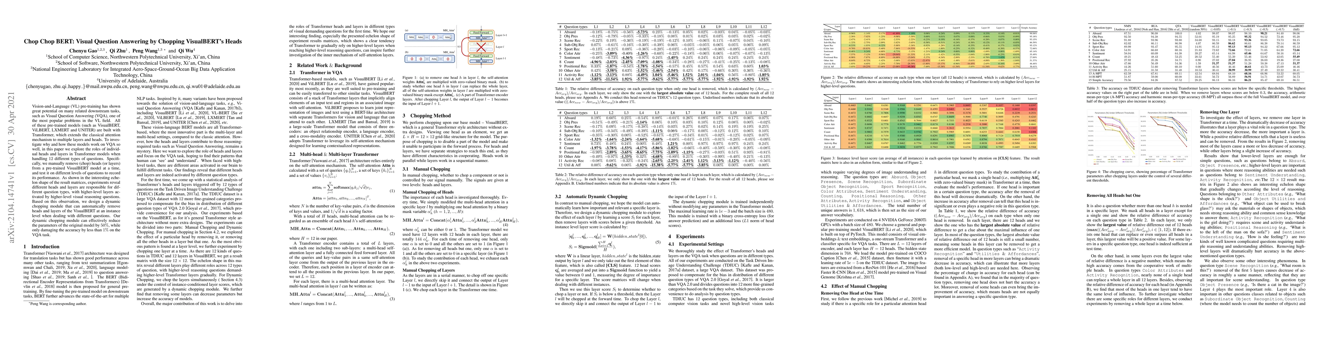 Vision-and-Language (VL) pre-training has shown great potential on many related downstream tasks, such as Visual Question Answering (VQA), one of the most popular problems in the VL field. All of these pre-trained models (such as VisualBERT, ViLBERT, LXMERT and UNITER) are built with Transformer, which extends the classical attention mechanism to multiple layers and heads. To investigate why and how these models work on VQA so well, in this paper we explore the roles of individual heads and layers in Transformer models when handling $12$ different types of questions. Specifically, we manually remove (chop) heads (or layers) from a pre-trained VisualBERT model at a time, and test it on different levels of questions to record its performance. As shown in the interesting echelon shape of the result matrices, experiments reveal different heads and layers are responsible for different question types, with higher-level layers activated by higher-level visual reasoning questions. Based on this observation, we design a dynamic chopping module that can automatically remove heads and layers of the VisualBERT at an instance level when dealing with different questions. Our dynamic chopping module can effectively reduce the parameters of the original model by 50%, while only damaging the accuracy by less than 1% on the VQA task.