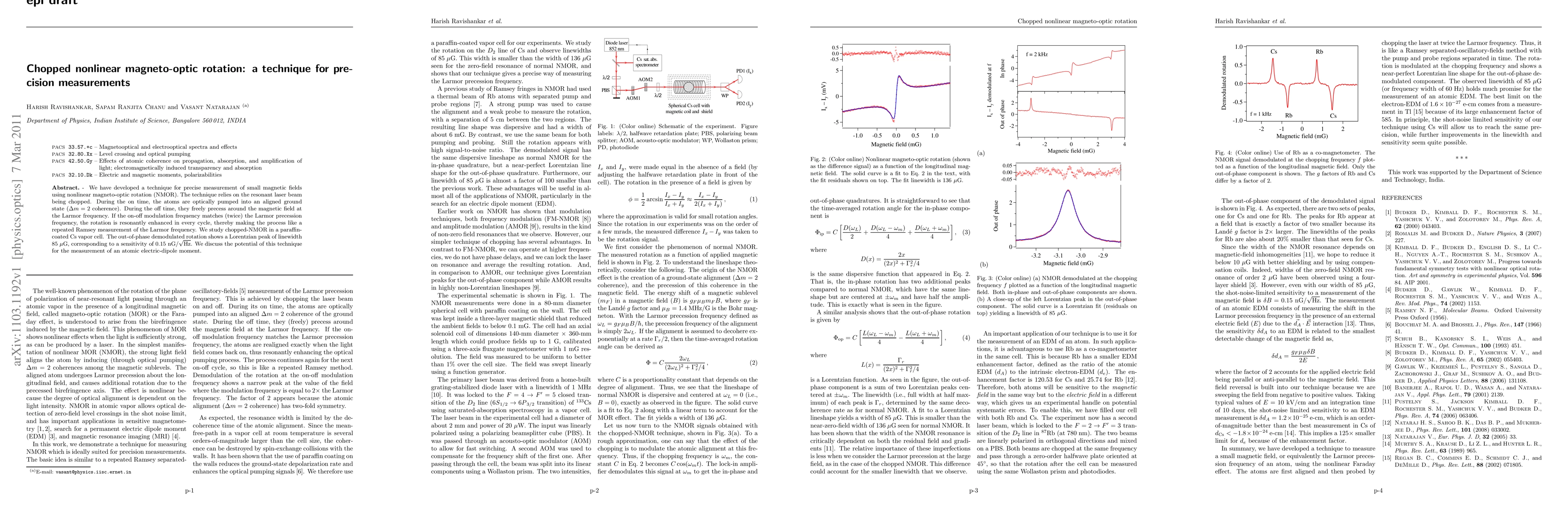 We have developed a technique for precise measurement of small magnetic fields using nonlinear magneto-optic rotation (NMOR). The technique relies on the resonant laser beam being chopped. During the on time, the atoms are optically pumped into an aligned ground state ($\Delta m=2$ coherence). During the off time, they freely precess around the magnetic field at the Larmor frequency. If the on-off modulation frequency matches (twice) the Larmor precession frequency, the rotation is resonantly enhanced in every cycle, thereby making the process like a repeated Ramsey measurement of the Larmor frequency. We study chopped-NMOR in a paraffin-coated Cs vapor cell. The out-of-phase demodulated rotation shows a Lorentzian peak of linewidth 85 $\mu$G, corresponding to a sensitivity of 0.15 nG/$\sqrt{{\rm Hz}}$. We discuss the potential of this technique for the measurement of an atomic electric-dipole moment.