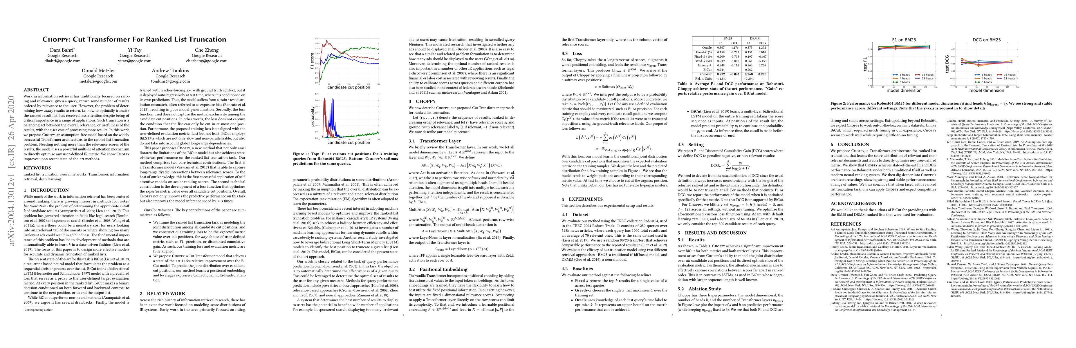 The paper proposes Choppy, a Transformer-based model for optimizing the truncation of ranked search result lists, balancing relevance and user cost. Choppy leverages multi-head attention to directly optimize user-defined metrics, outperforming recent state-of-the-art methods.