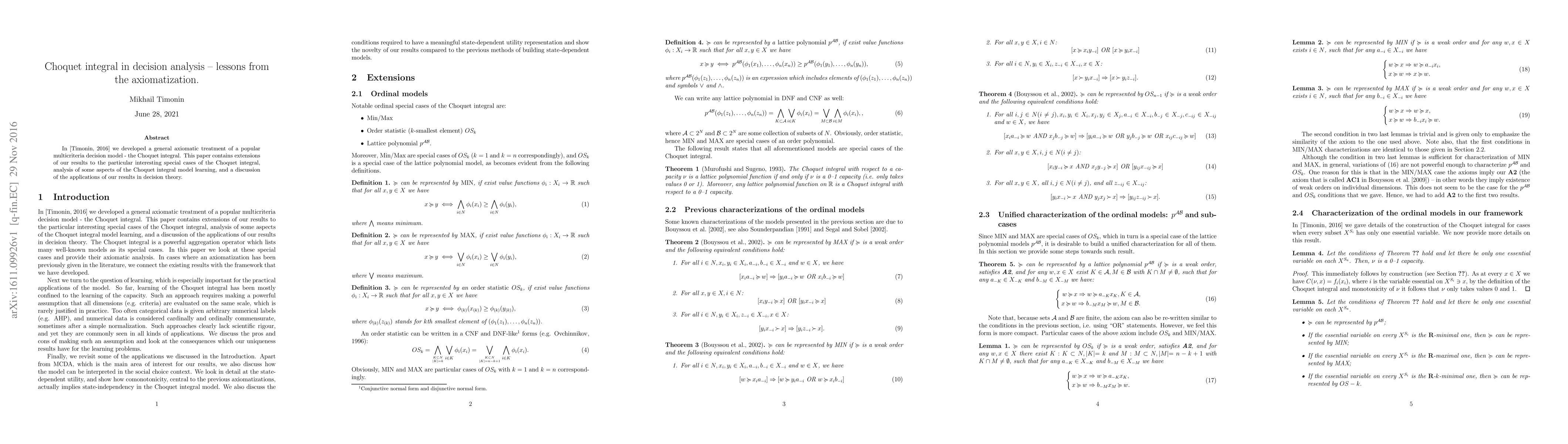 This paper explores the Choquet integral's role in decision analysis through an axiomatic lens, comparing its special cases and connecting existing results to a developed framework. It critiques the common practice of learning the Choquet integral by assuming commensurability across dimensions, arguing for greater scientific rigor and discussing the implications of axiomatization uniqueness on learning.