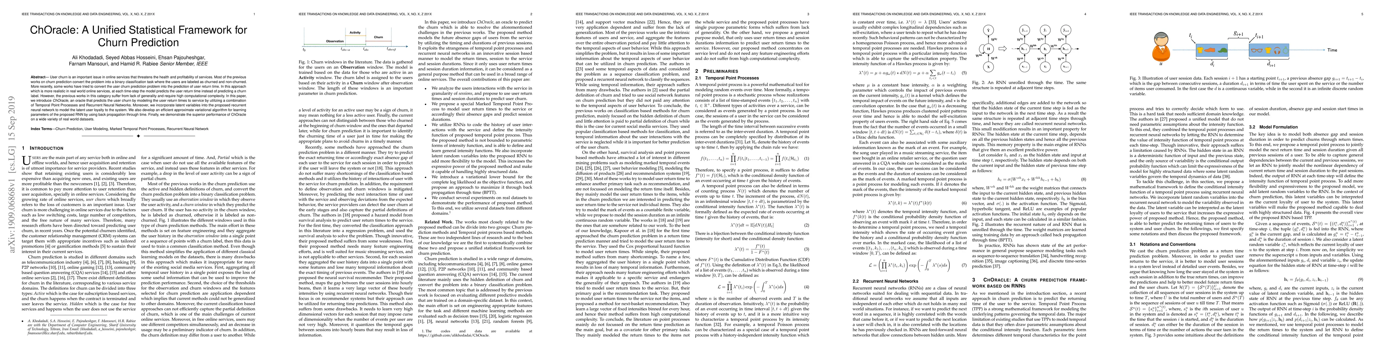 The paper introduces ChOracle, a unified statistical framework for predicting user churn in online services by modeling user return times using Temporal Point Processes and Recurrent Neural Networks, with latent variables to capture user loyalty, and an efficient variational algorithm for parameter learning. ChOracle demonstrates superior performance across various real-world datasets.