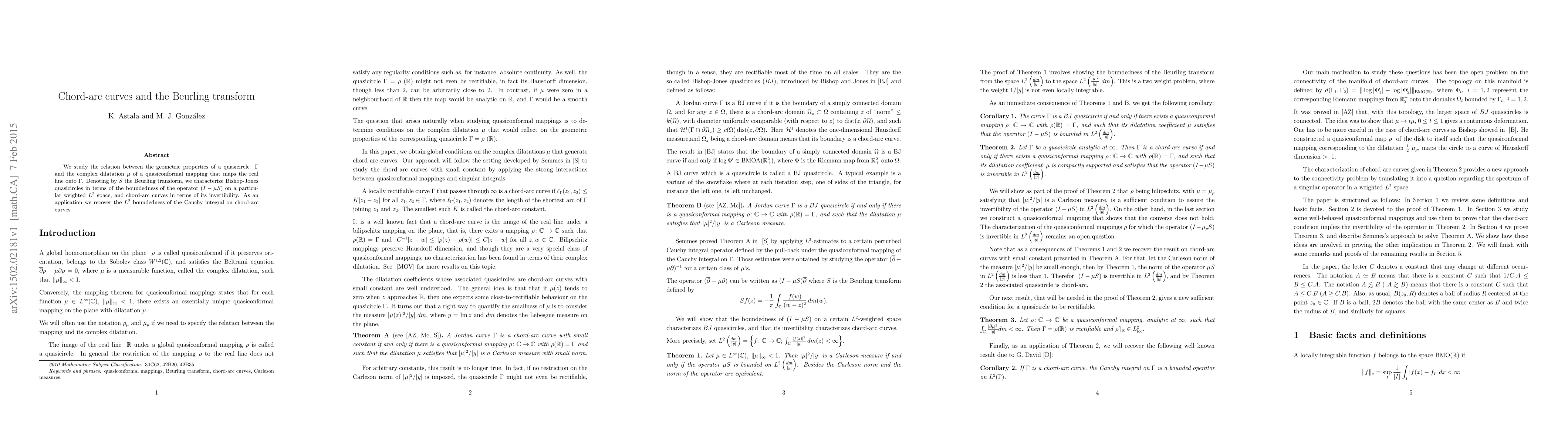 We study the relation between the geometric properties of a quasicircle~$\Gamma$ and the complex dilatation~$\mu$ of a quasiconformal mapping that maps the real line onto~$\Gamma$. Denoting by~$S$ the Beurling transform, we characterize Bishop-Jones quasicircles in terms of the boundedness of the operator~$(I-\mu S)$ on a particular weighted $L^2$~space, and chord-arc curves in terms of its invertibility. As an application we recover the~$L^2$ boundedness of the Cauchy integral on chord-arc curves.