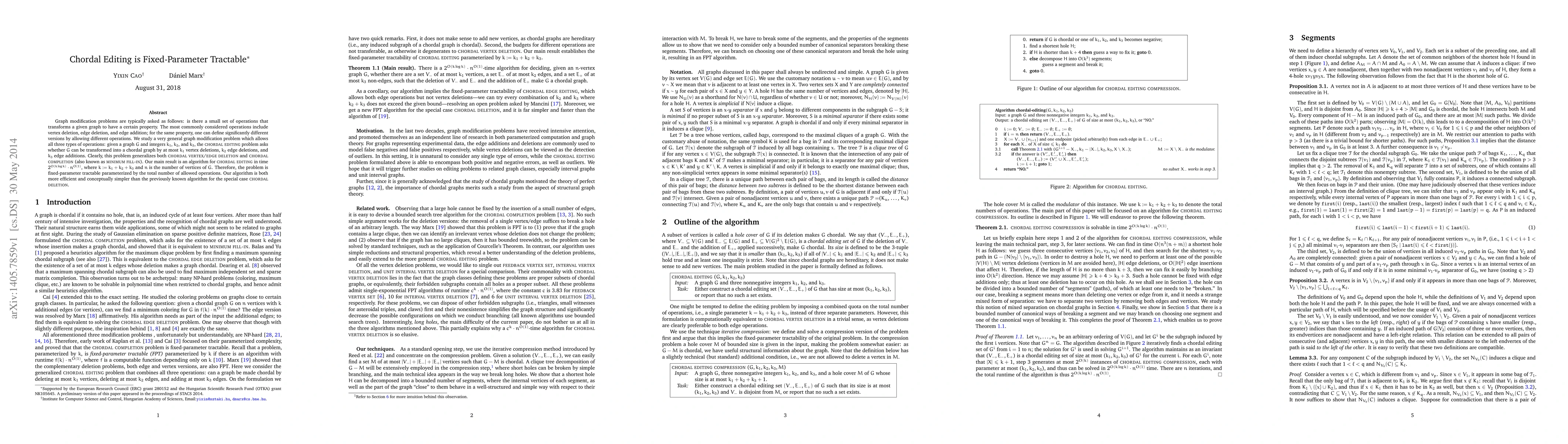 The paper demonstrates that the chordal editing problem, which involves transforming a graph into a chordal graph through vertex and edge modifications, is fixed-parameter tractable. The authors present an efficient algorithm running in $2^{O(k\log k)}\cdot n^{O(1)}$ time, where $k$ is the total number of allowed operations.