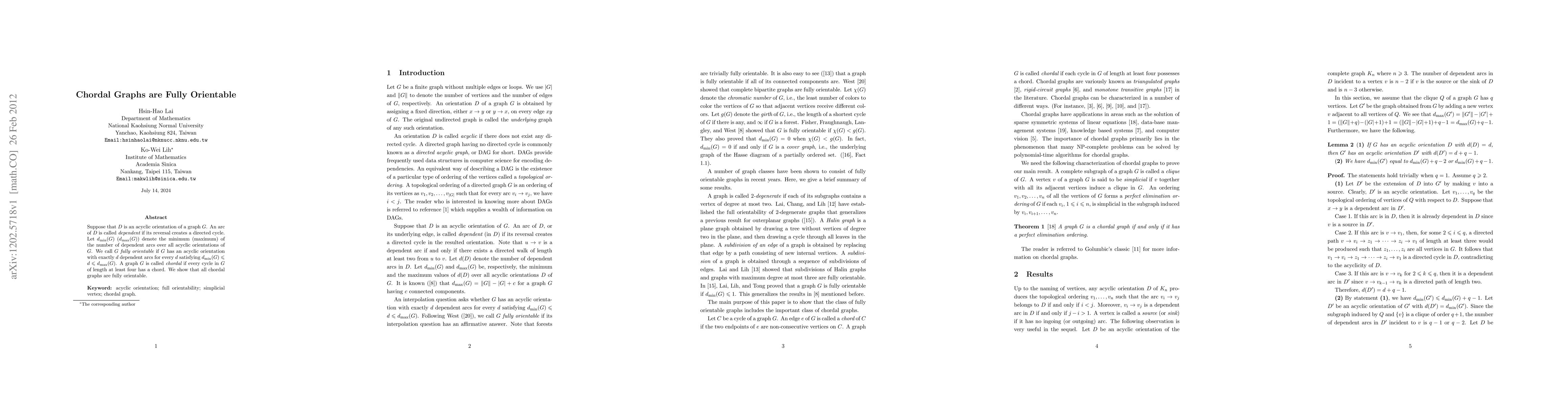 This paper demonstrates that chordal graphs are fully orientable, meaning they can be oriented acyclically with any number of dependent arcs between the minimum and maximum possible values. The study focuses on the properties of acyclic orientations and their dependent arcs in chordal graphs.