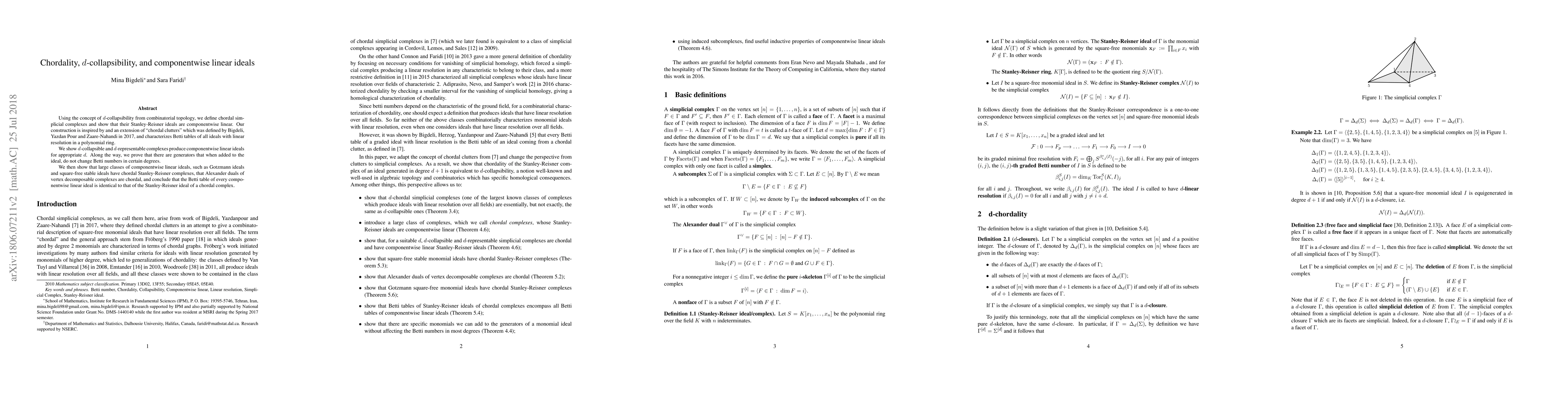This paper establishes a connection between chordal simplicial complexes and $d$-collapsibility, demonstrating that their Stanley-Reisner ideals are componentwise linear. It characterizes Betti tables of all ideals with linear resolution and shows that various classes of componentwise linear ideals have chordal Stanley-Reisner complexes.