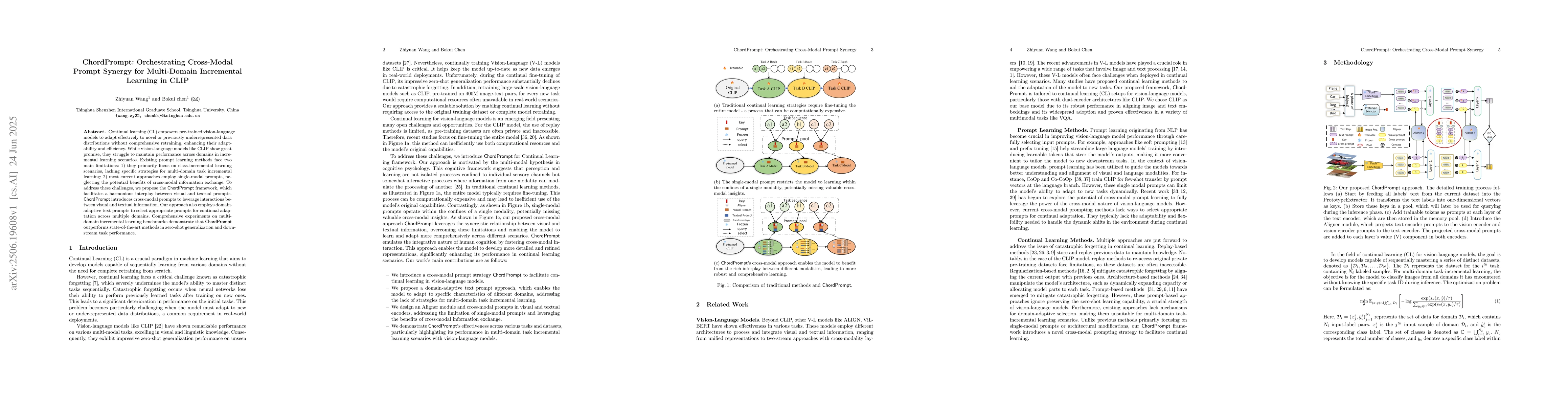 Continual learning (CL) empowers pre-trained vision-language models to adapt effectively to novel or previously underrepresented data distributions without comprehensive retraining, enhancing their adaptability and efficiency. While vision-language models like CLIP show great promise, they struggle to maintain performance across domains in incremental learning scenarios. Existing prompt learning methods face two main limitations: 1) they primarily focus on class-incremental learning scenarios, lacking specific strategies for multi-domain task incremental learning; 2) most current approaches employ single-modal prompts, neglecting the potential benefits of cross-modal information exchange. To address these challenges, we propose the \ChordPrompt framework, which facilitates a harmonious interplay between visual and textual prompts. \ChordPrompt introduces cross-modal prompts to leverage interactions between visual and textual information. Our approach also employs domain-adaptive text prompts to select appropriate prompts for continual adaptation across multiple domains. Comprehensive experiments on multi-domain incremental learning benchmarks demonstrate that \ChordPrompt outperforms state-of-the-art methods in zero-shot generalization and downstream task performance.