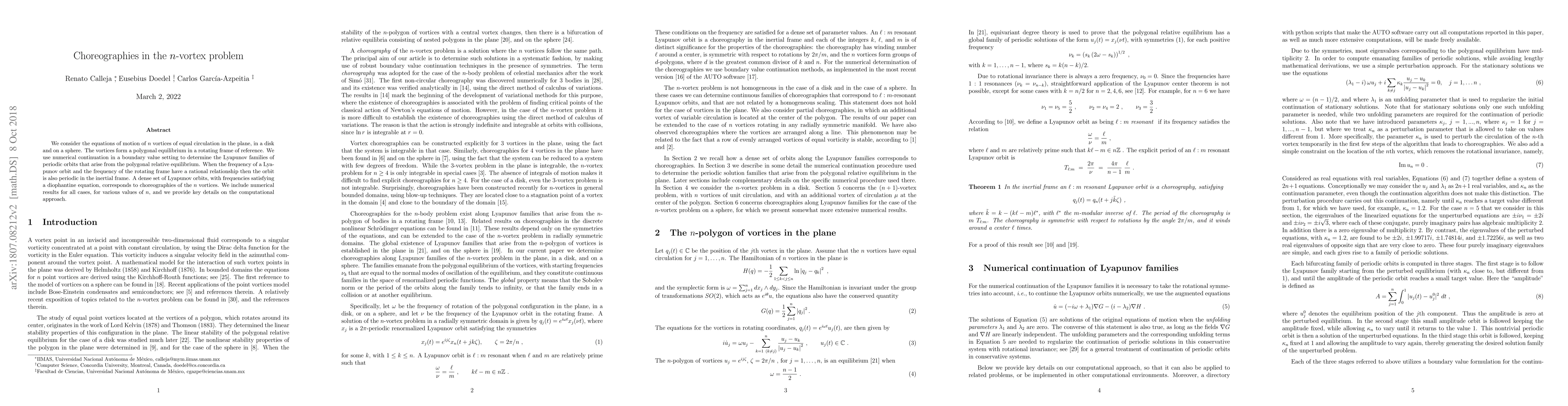 Researchers studied how vortices in a rotating frame of reference create choreographed movements when observed from an inertial frame, finding dense sets of orbits with specific frequency patterns.
