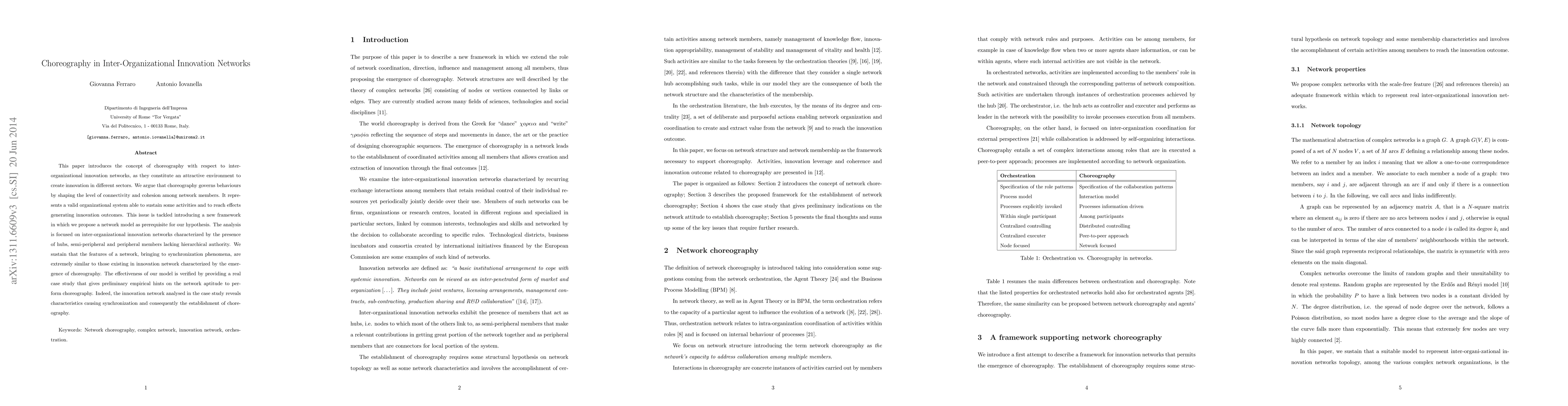 This paper introduces the concept of choreography with respect to inter-organizational innovation networks, as they constitute an attractive environment to create innovation in different sectors. We argue that choreography governs behaviours by shaping the level of connectivity and cohesion among network members. It represents a valid organizational system able to sustain some activities and to reach effects generating innovation outcomes. This issue is tackled introducing a new framework in which we propose a network model as prerequisite for our hypothesis. The analysis is focused on inter-organizational innovation networks characterized by the presence of hubs, semi-peripheral and peripheral members lacking hierarchical authority. We sustain that the features of a network, bringing to synchronization phenomena, are extremely similar to those existing in innovation network characterized by the emergence of choreography. The effectiveness of our model is verified by providing a real case study that gives preliminary empirical hints on the network aptitude to perform choreography. Indeed, the innovation network analysed in the case study reveals characteristics causing synchronization and consequently the establishment of choreography.