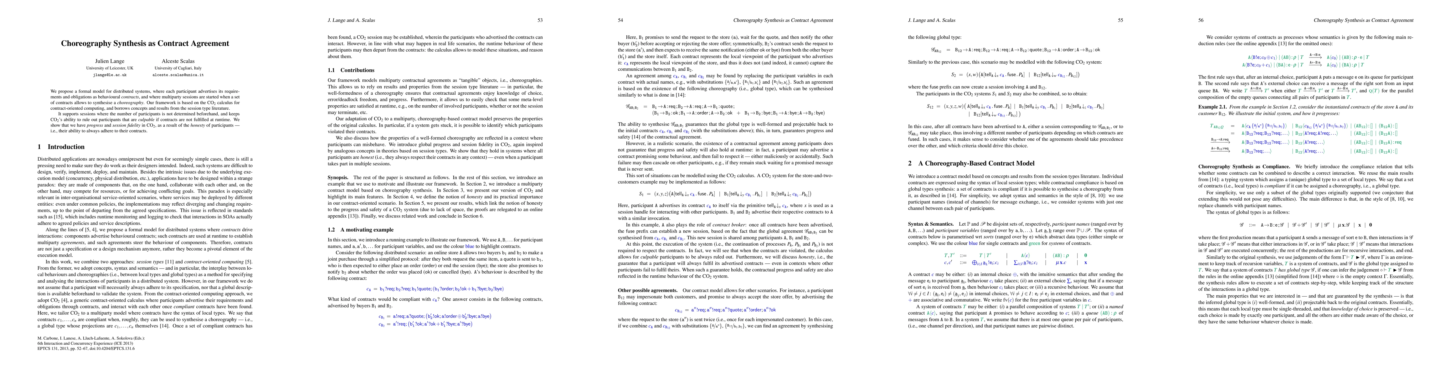 We propose a formal model for distributed systems, where each participant advertises its requirements and obligations as behavioural contracts, and where multiparty sessions are started when a set of contracts allows to synthesise a choreography. Our framework is based on the CO2 calculus for contract-oriented computing, and borrows concepts and results from the session type literature. It supports sessions where the number of participants is not determined beforehand, and keeps CO2's ability to rule out participants that are culpable if contracts are not fulfilled at runtime. We show that we have progress and session fidelity in CO2, as a result of the honesty of participants - i.e., their ability to always adhere to their contracts.