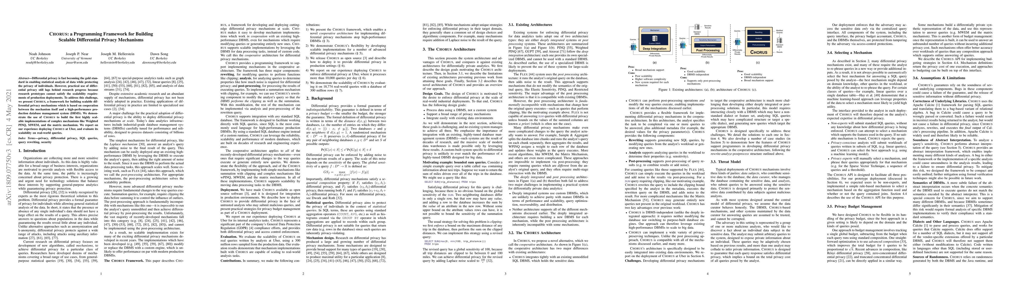Chorus is a framework designed to build scalable differential privacy mechanisms by integrating with high-performance DBMSs. It enables the deployment of complex mechanisms like Weighted PINQ, MWEM, and matrix mechanisms at production scale, as demonstrated through its use at Uber.