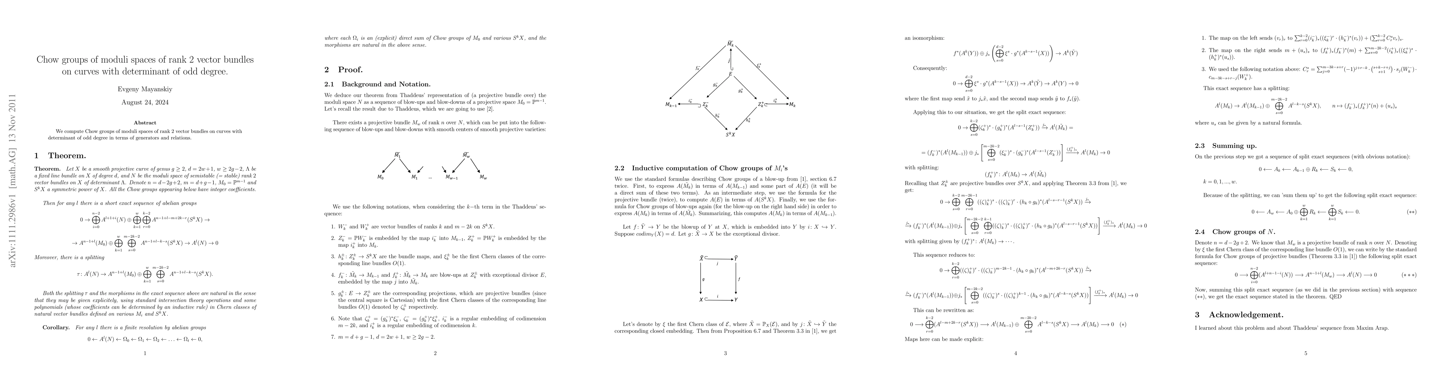Summary: The paper calculates the Chow groups for moduli spaces of rank 2 vector bundles on curves where the determinant has odd degree, providing explicit generators and relations for these groups.