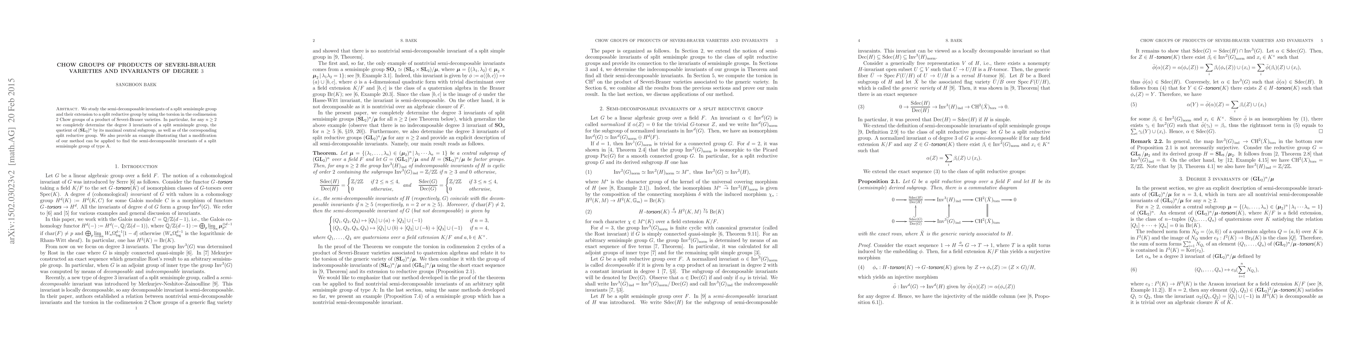 Summary: This paper explores the degree 3 invariants of split semisimple and reductive groups via torsion in the codimension 2 Chow groups of Severi-Brauer varieties products, determining these invariants completely for $(\operatorname{\mathbf{SL}}_{2})^{n}$ quotients and demonstrating a method extension for type A groups.