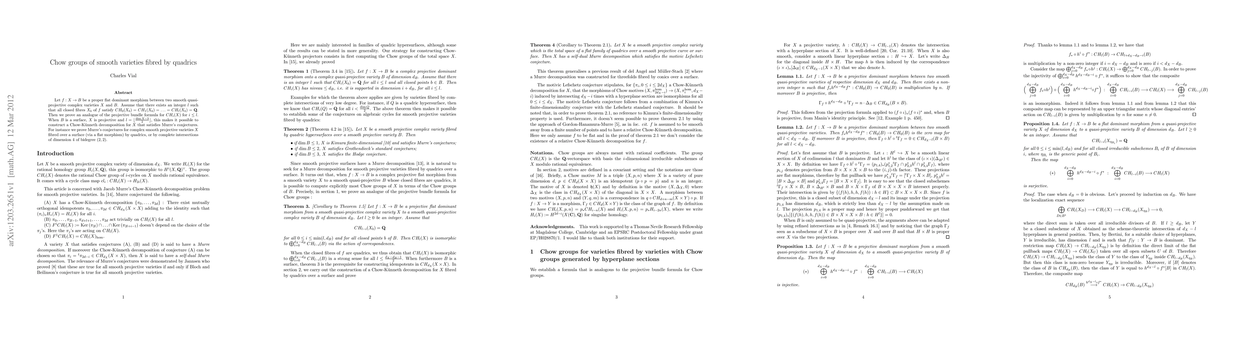 This research proves an analogue of the projective bundle formula for Chow groups of smooth varieties fibred by quadrics under certain conditions. When the base is a surface, projective X, and l = ⌊(dim X - 3)/2⌋, it enables the construction of a Chow-Künneth decomposition for X adhering to Murre's conjectures. The findings apply to complex smooth projective varieties X fibred over a surface by quadrics or complete intersections of dimension 4 with bidegree (2,2).