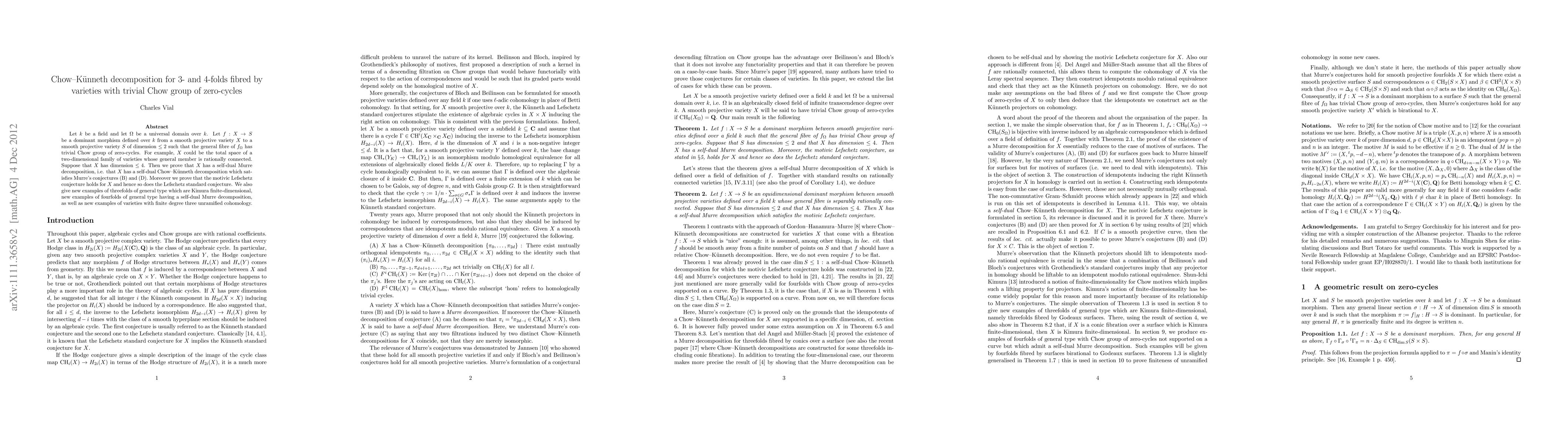 The paper proves that certain smooth projective varieties (up to dimension 4) with a trivial Chow group of zero-cycles in their general fibers have self-dual Chow-Kuenneth decompositions satisfying Murre's conjectures. It also verifies the motivic Lefschetz conjecture for these varieties and provides new examples of specific threefolds and fourfolds fitting these criteria.