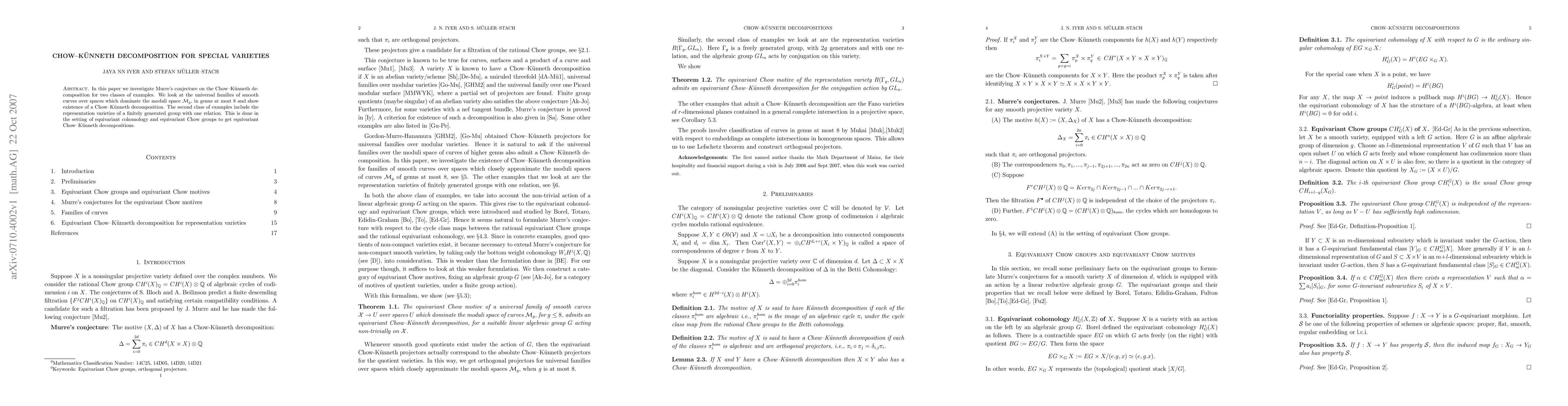 In this paper we investigate Murre's conjecture on the Chow--K\"unneth decomposition for two classes of examples. We look at the universal families of smooth curves over spaces which dominate the moduli space $\cM_g$, in genus at most 8 and show existence of a Chow--K\"unneth decomposition. The second class of examples include the representation varieties of a finitely generated group with one relation. This is done in the setting of equivariant cohomology and equivariant Chow groups to get equivariant Chow--K\"unneth decompositions.
