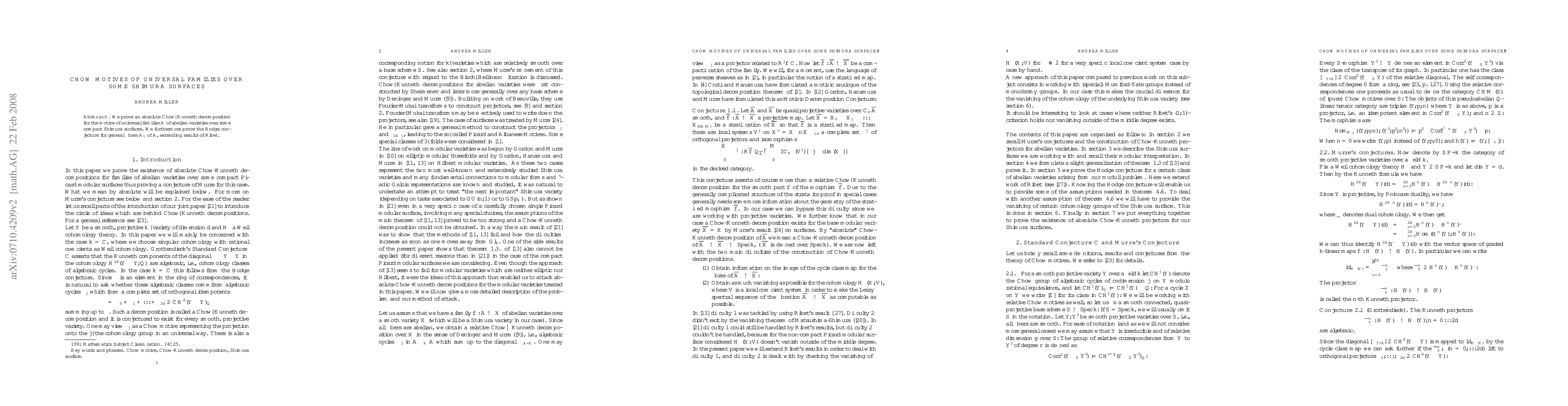 Summary: This paper establishes an absolute Chow-Kuenneth decomposition for the motive of universal families of abelian varieties over certain Shimura surfaces and proves the Hodge conjecture for their general fibers, building on Ribet's earlier results.
