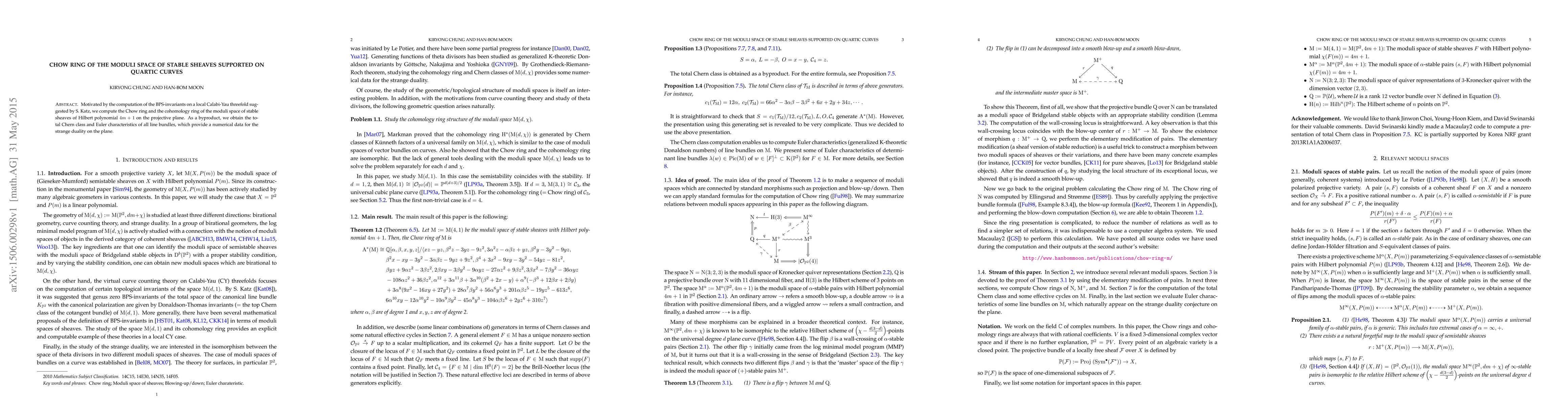 Motivated by the computation of the BPS-invariants on a local Calabi-Yau threefold suggested by S. Katz, we compute the Chow ring and the cohomology ring of the moduli space of stable sheaves of Hilbert polynomial $4m+1$ on the projective plane. As a byproduct, we obtain the total Chern class and Euler characteristics of all line bundles, which provide a numerical data for the strange duality on the plane.