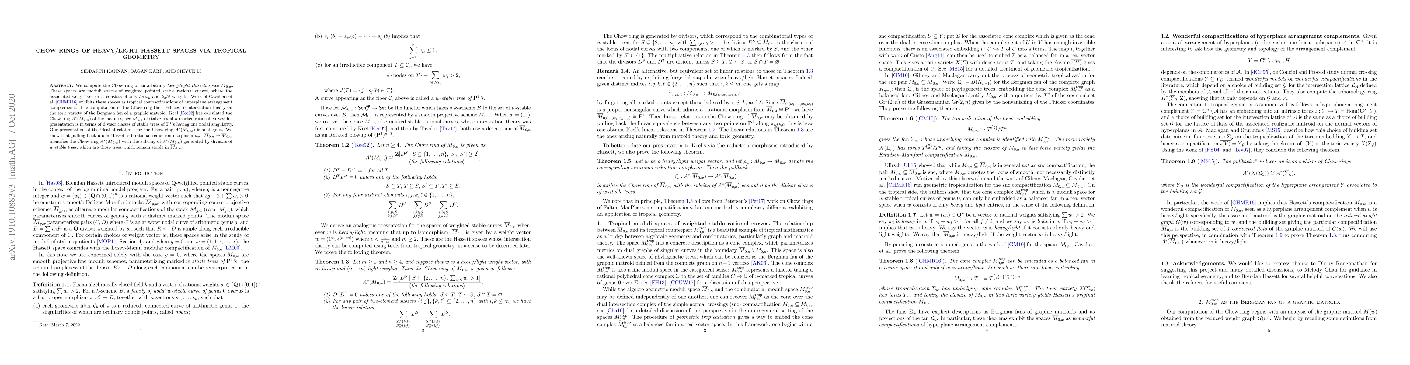 This paper computes the Chow ring of weighted pointed stable rational curves in heavy/light Hassett spaces $\bar{M}_{0, w}$ using tropical geometry. It demonstrates a connection to toric varieties through Bergman fans, ultimately showing that the Chow ring of $\bar{M}_{0, w}$ is a subring of $\bar{M}_{0, n}$ generated by divisors of $w$-stable trees.