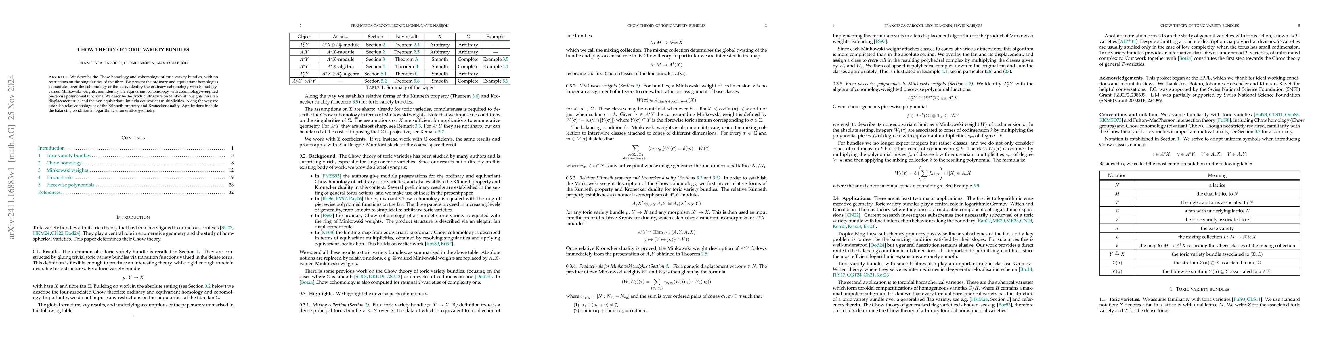 We describe the Chow homology and cohomology of toric variety bundles, with no restrictions on the singularities of the fibre. We present the ordinary and equivariant homologies as modules over the cohomology of the base, identify the ordinary cohomology with homology-valued Minkowski weights, and identify the equivariant cohomology with cohomology-weighted piecewise polynomial functions. We describe the product structure on Minkowski weights via a fan displacement rule, and the non-equivariant limit via equivariant multiplicities. Along the way we establish relative analogues of the K\"unneth property and Kronecker duality. Applications include the balancing condition in logarithmic enumerative geometry.