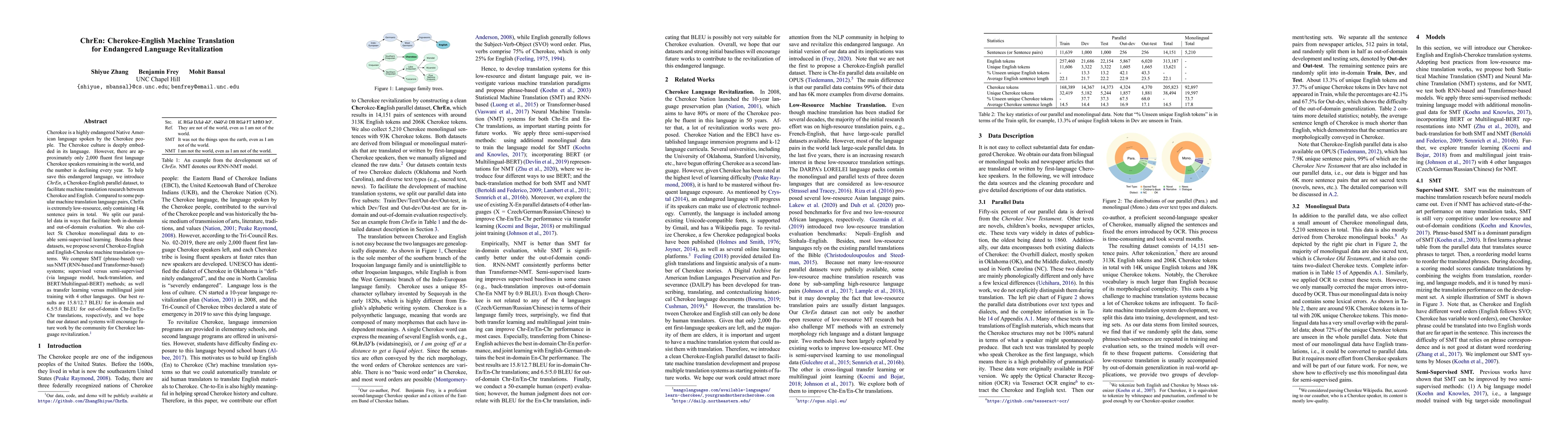 This paper introduces ChrEn, a Cherokee-English parallel dataset aimed at facilitating machine translation research for endangered language revitalization. The study compares various machine translation systems, achieving 15.8/12.7 BLEU for in-domain and 6.5/5.0 for out-of-domain translations, and hopes to inspire further efforts in Cherokee language preservation.