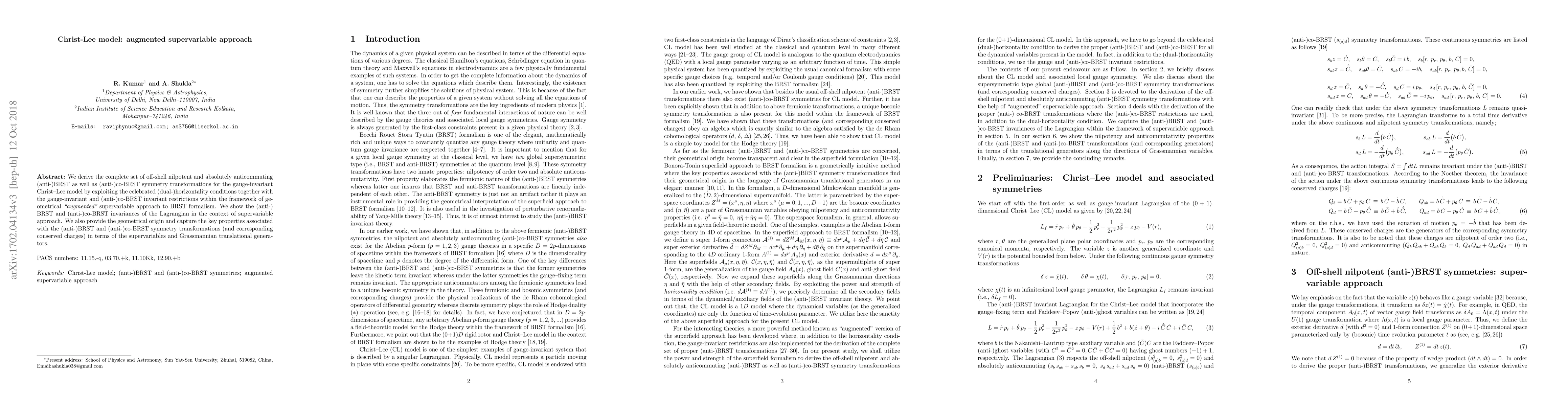 This paper derives the complete set of (anti-)BRST and (anti-)co-BRST symmetry transformations for the Christ-Lee model using the augmented supervariable approach, demonstrating their invariance and exploring their geometrical origins and properties.