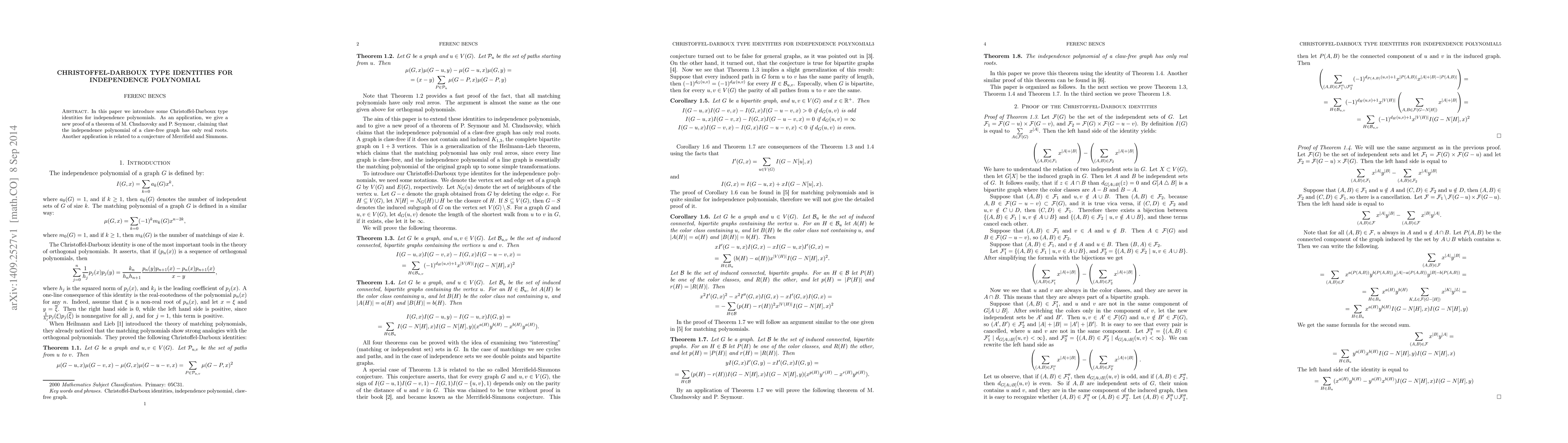 This paper presents Christoffel-Darboux type identities for independence polynomials and uses them to provide a new proof of the theorem by Chudnovsky and Seymour that claw-free graph independence polynomials have only real roots. It also connects to a conjecture by Merrifield and Simmons.