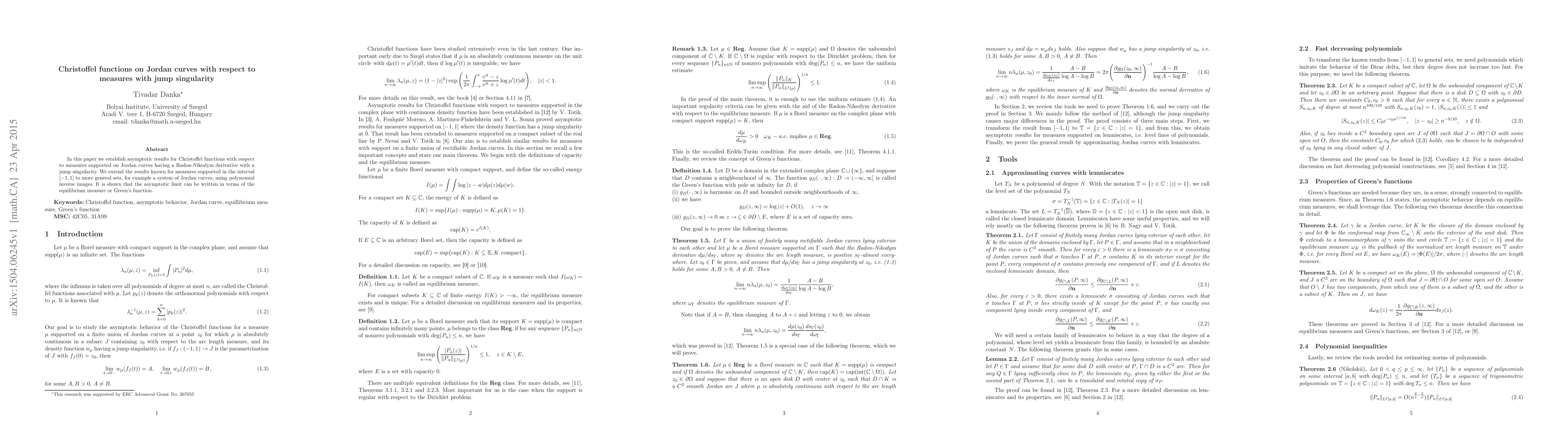In this paper we establish asymptotic results for Christoffel functions with respect to measures supported on Jordan curves having a Radon-Nikodym derivative with a jump singularity. We extend the results known for measures supported in the interval $ [-1,1] $ to more general sets, for example a system of Jordan curves, using polynomial inverse images. It is shown that the asymptotic limit can be written in terms of the equilibrium measure or Green's function.