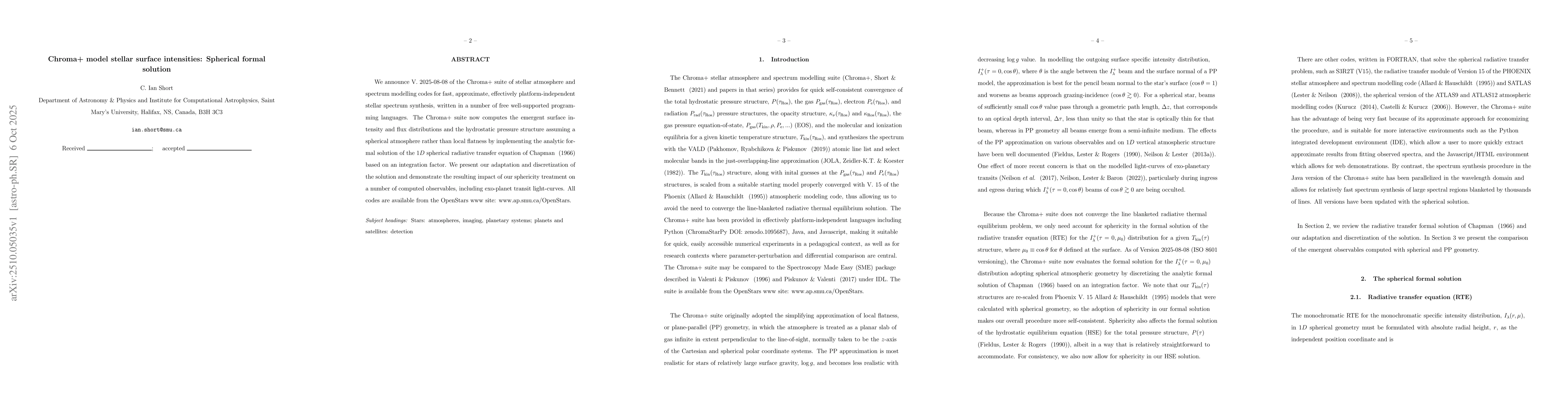 We announce V. 2025-08-08 of the Chroma+ suite of stellar atmosphere and spectrum modelling codes for fast, approximate, effectively platform-independent stellar spectrum synthesis, written in a number of free well-supported programming languages. The Chroma+ suite now computes the emergent surface intensity and flux distributions and the hydrostatic pressure structure assuming a spherical atmosphere rather than local flatness by implementing the analytic formal solution of the 1D spherical radiative transfer equation of Chapman (1966} based on an integration factor. We present our adaptation and discretization of the solution and demonstrate the resulting impact of our sphericity treatment on a number of computed observables, including exo-planet transit light-curves. All codes are available from the OpenStars www site: www.ap.smu.ca/OpenStars.