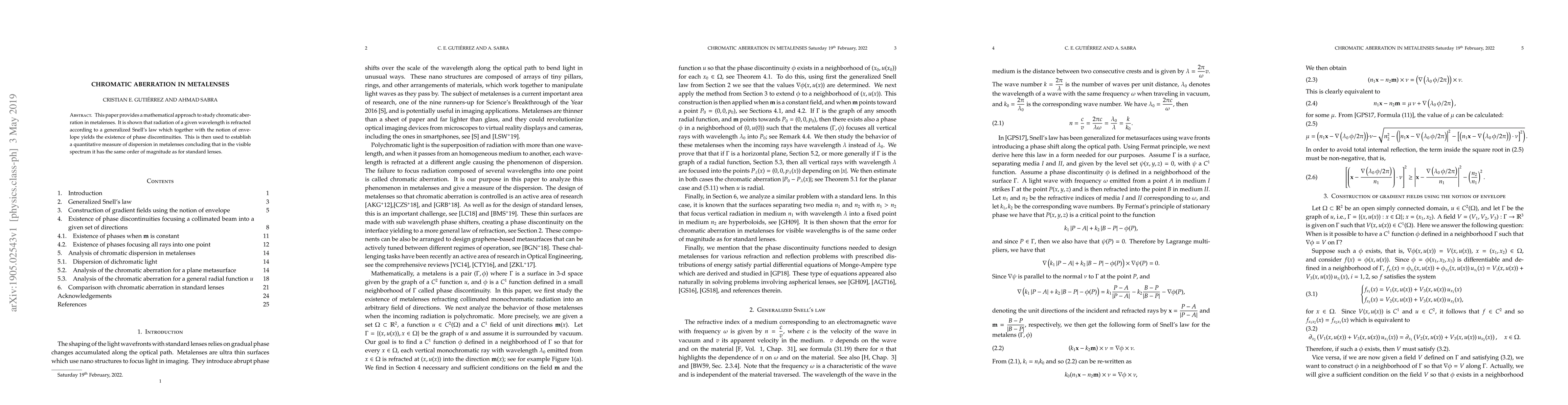 This paper provides a mathematical approach to study chromatic aberration in metalenses. It is shown that radiation of a given wavelength is refracted according to a generalized Snell's law which together with the notion of envelope yields the existence of phase discontinuities. This is then used to establish a quantitative measure of dispersion in metalenses concluding that in the visible spectrum it has the same order of magnitude as for standard lenses.