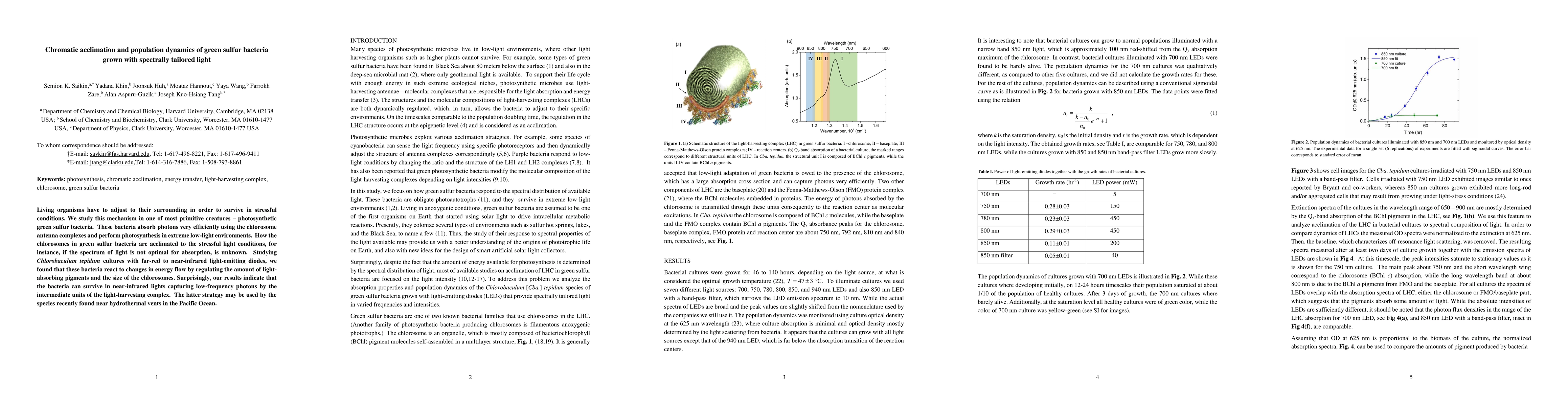 This study explores how green sulfur bacteria, specifically Chlorobaculum tepidum, adapt to varying light spectra by regulating their light-absorbing pigments and chlorosomes. The research reveals that these bacteria can survive and utilize near-infrared light, suggesting a potential survival mechanism for species found near hydrothermal vents.