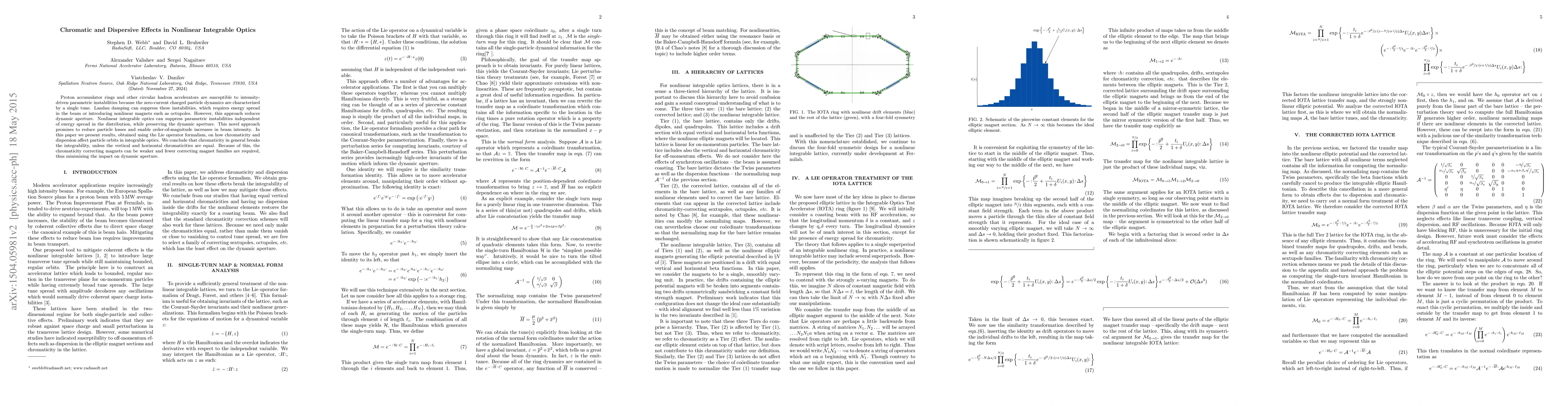 Proton accumulator rings and other circular hadron accelerators are susceptible to intensity-driven parametric instabilities because the zero-current charged particle dynamics are characterized by a single tune. Landau damping can suppress these instabilities, which requires energy spread in the beam or introducing nonlinear magnets such as octupoles. However, this approach reduces dynamic aperture. Nonlinear integrable optics can suppress parametric instabilities independent of energy spread in the distribution, while preserving the dynamic aperture. This novel approach promises to reduce particle losses and enable order-of-magnitude increases in beam intensity. In this paper we present results, obtained using the Lie operator formalism, on how chromaticity and dispersion affect particle orbits in integrable optics. We conclude that chromaticity in general breaks the integrability, unless the vertical and horizontal chromaticities are equal. Because of this, the chromaticity correcting magnets can be weaker and fewer correcting magnet families are required, thus minimizing the impact on dynamic aperture.
