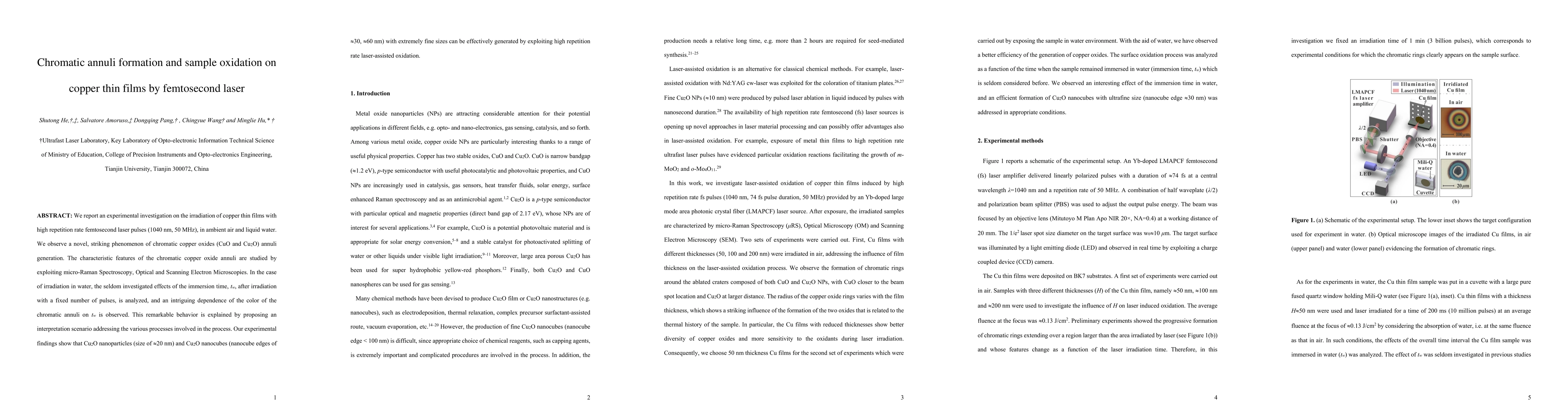 This research investigates the formation of chromatic copper oxide annuli on copper thin films via high repetition rate femtosecond laser pulses in air and water, revealing an intriguing dependence of oxide color on immersion time. The study elucidates the processes behind this phenomenon and demonstrates the generation of fine cuprous oxide nanoparticles and nanocubes.
