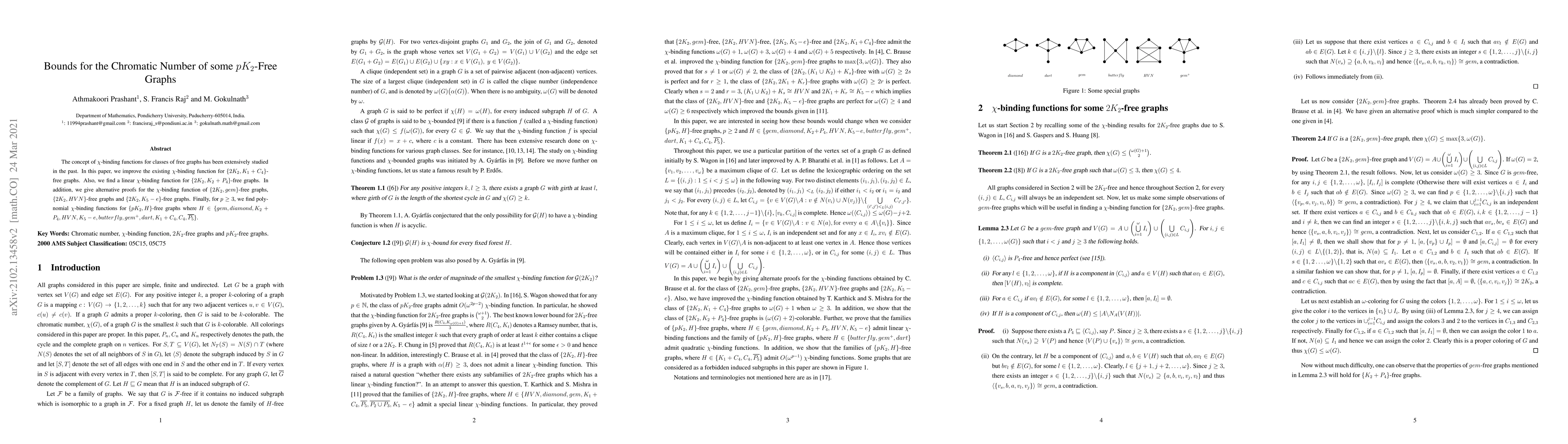 The concept of $\chi$-binding functions for classes of free graphs has been extensively studied in the past. In this paper, we improve the existing $\chi$-binding function for $\{2K_2, K_1 + C_4\}$-free graphs. Also, we find a linear $\chi$-binding function for $\{2K_2, K_2+P_4\}$-free graphs. In addition, we give alternative proofs for the $\chi$-binding function of $\{2K_2,gem\}$-free graphs, $\{2K_2,HVN\}$-free graphs and $\{2K_2, K_5-e\}$-free graphs. Finally, for $p\geq3$, we find polynomial $\chi$-binding functions for $\{pK_2, H\}$-free graphs where $H\in \{gem, diamond, K_2+P_4, HVN, K_5-e, butterfly, gem^+, dart, K_1 + C_4, C_4, \overline{P_5}\}$.