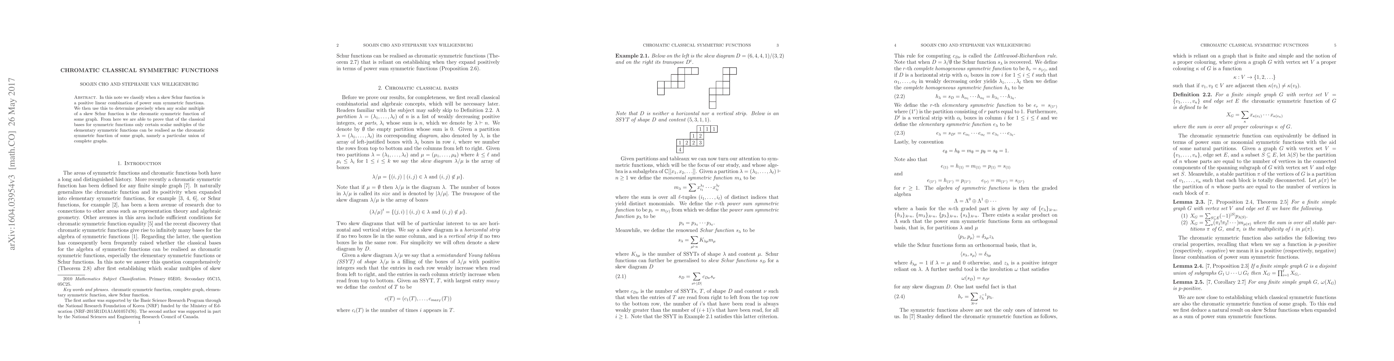 In this note we classify when a skew Schur function is a positive linear combination of power sum symmetric functions. We then use this to determine precisely when any scalar multiple of a skew Schur function is the chromatic symmetric function of some graph. From here we are able to prove that of the classical bases for symmetric functions only certain scalar multiples of the elementary symmetric functions can be realised as the chromatic symmetric function of some graph, namely a particular union of complete graphs.