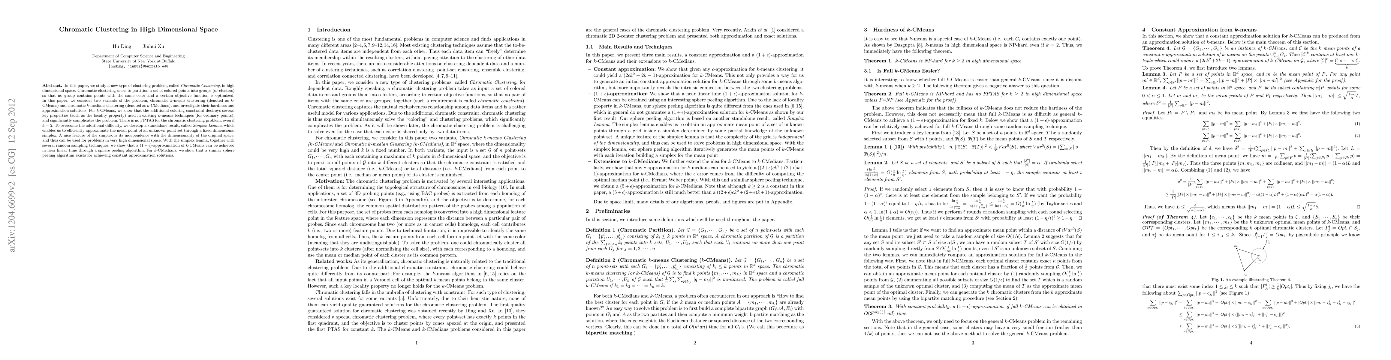 In this paper, we study a new type of clustering problem, called {\em Chromatic Clustering}, in high dimensional space. Chromatic clustering seeks to partition a set of colored points into groups (or clusters) so that no group contains points with the same color and a certain objective function is optimized. In this paper, we consider two variants of the problem, chromatic $k$-means clustering (denoted as $k$-CMeans) and chromatic $k$-medians clustering (denoted as $k$-CMedians), and investigate their hardness and approximation solutions. For $k$-CMeans, we show that the additional coloring constraint destroys several key properties (such as the locality property) used in existing $k$-means techniques (for ordinary points), and significantly complicates the problem. There is no FPTAS for the chromatic clustering problem, even if $k=2$. To overcome the additional difficulty, we develop a standalone result, called {\em Simplex Lemma}, which enables us to efficiently approximate the mean point of an unknown point set through a fixed dimensional simplex. A nice feature of the simplex is its independence with the dimensionality of the original space, and thus can be used for problems in very high dimensional space. With the simplex lemma, together with several random sampling techniques, we show that a $(1+\epsilon)$-approximation of $k$-CMeans can be achieved in near linear time through a sphere peeling algorithm. For $k$-CMedians, we show that a similar sphere peeling algorithm exists for achieving constant approximation solutions.